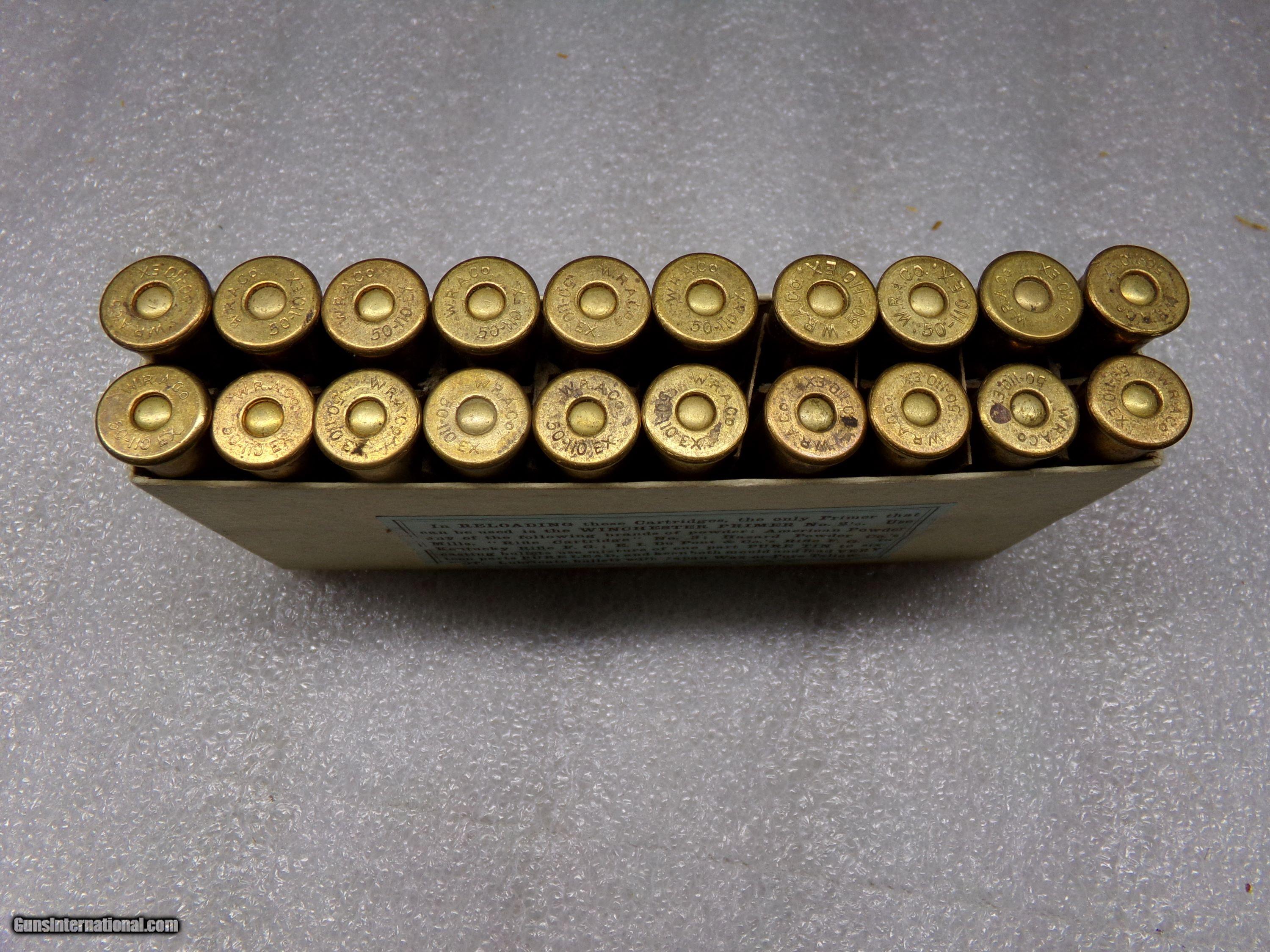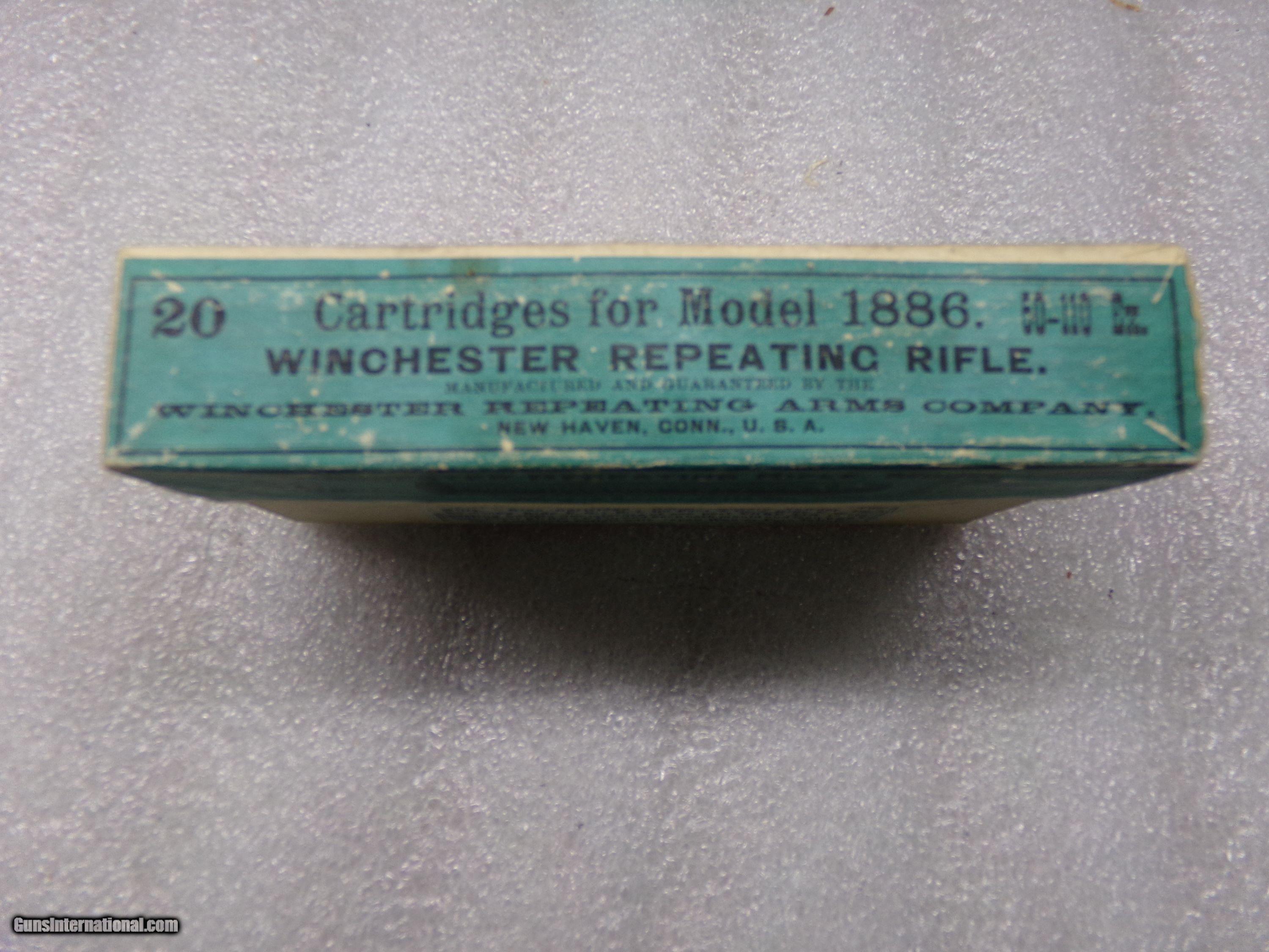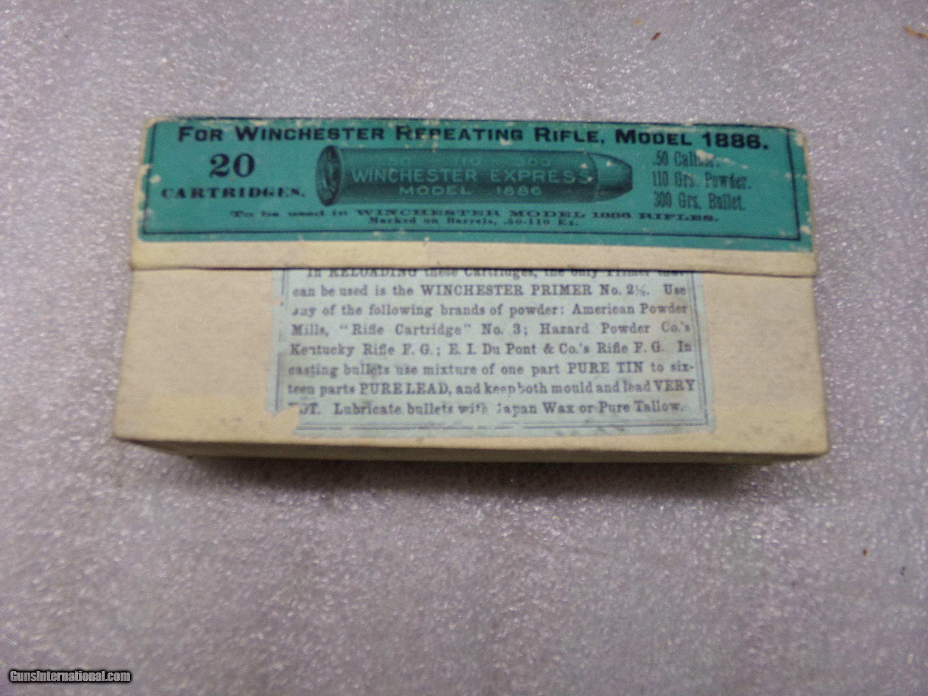 Description: Winchester 50-110-300 EXPRESS. This is a FULL and ORIGINAL BOX. Excellent Cond. and color. Early 1900's green, round cornered box. R3 rated by Giles. Cartridges are all excellent. Correct headstamp.Free shipping. No Calif sales. Please contact me with any questions or more pictures. Thank You! SOLD |
