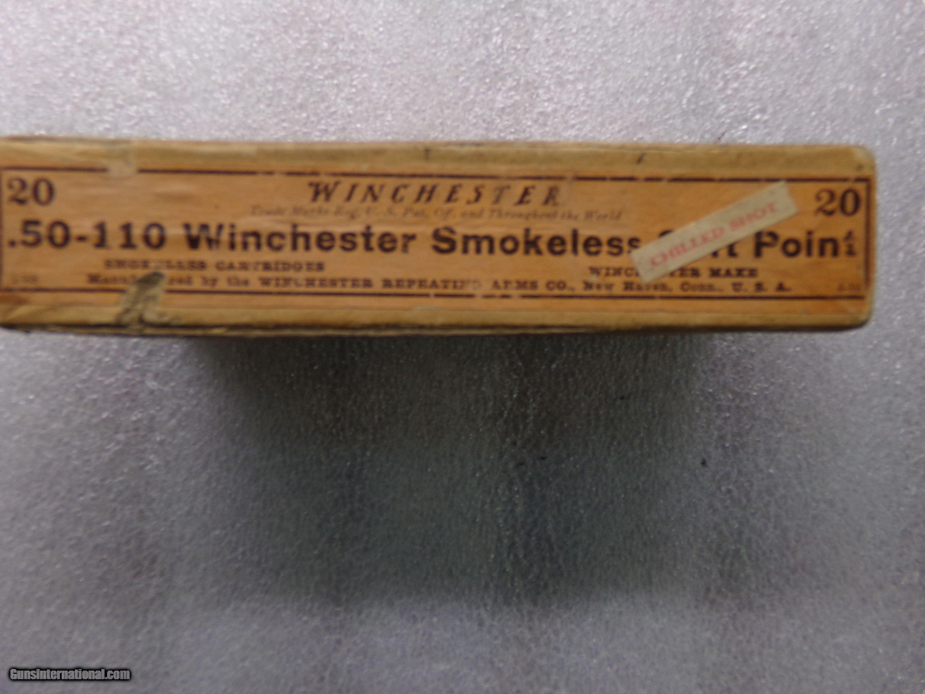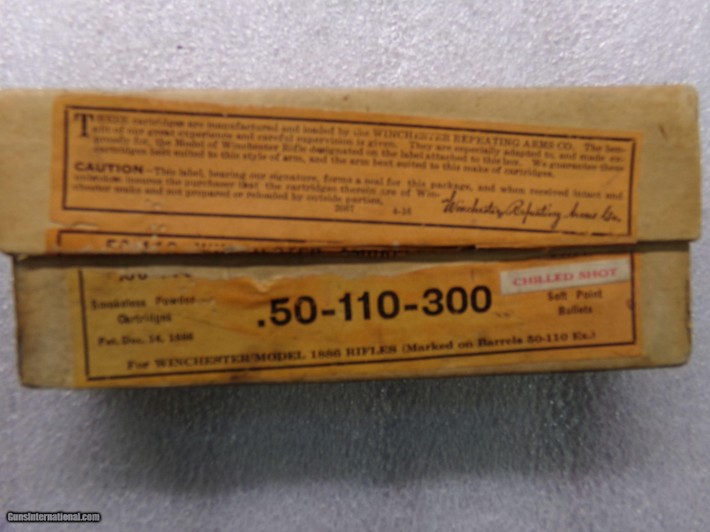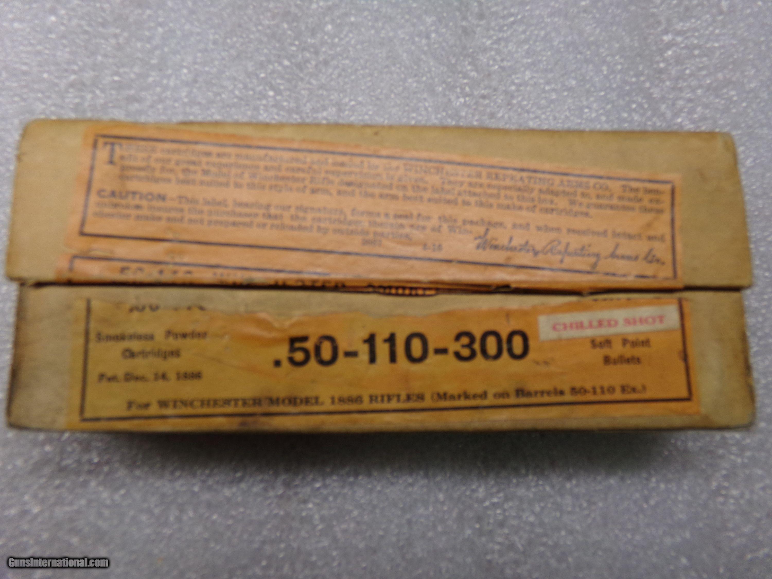 Description: Winchester .50-110-300 for 1886 rifles marked "50-110 EX". The box is full of original cartridges. 2 of which have been fired. Date 4-16. "CHILLED SHOT" add on sticker. Free shipping. No Calif sales. Thanks. SOLD |