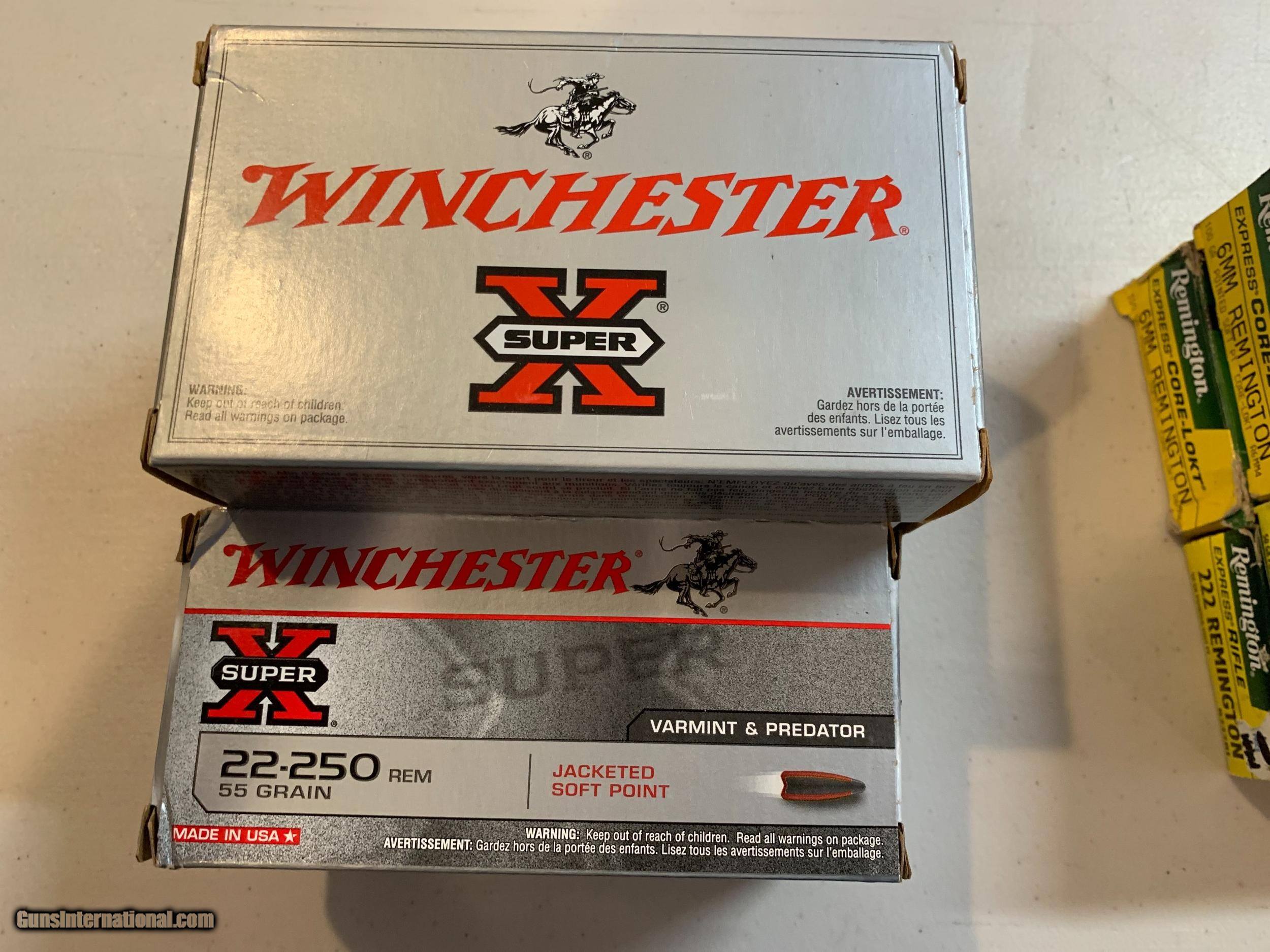 Description: Winchester brand ammo: 2 boxes 22-250 caliber 55 grain soft point 356 SOLD SOLD Rifle Caliber: .22-250 Remington |