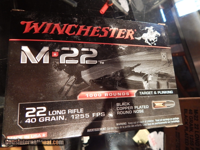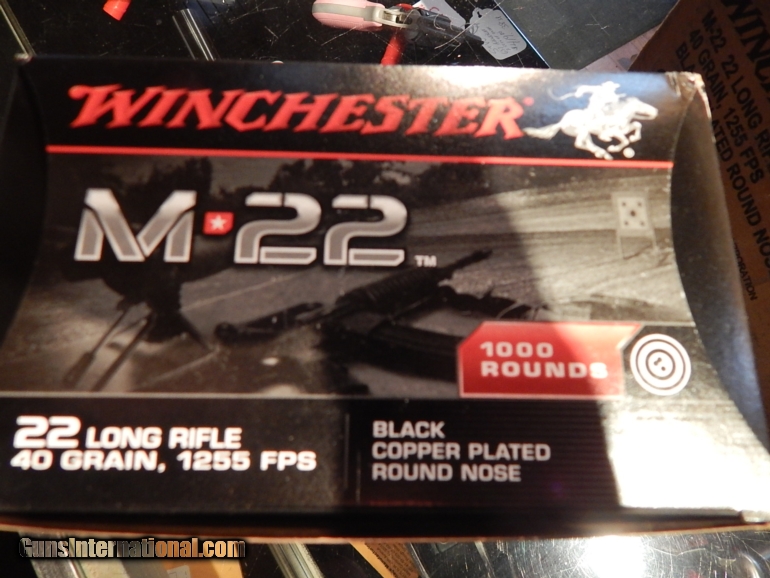 Description: New Winchester M-22 40 grain solid bullet box of 1000 rounds packed two bricks per box. Add 17.00 s/h SOLD |