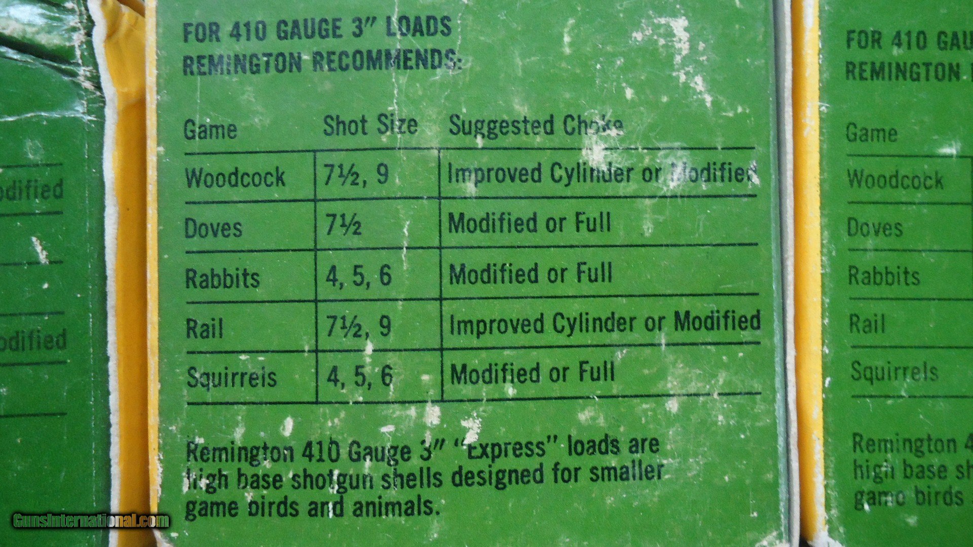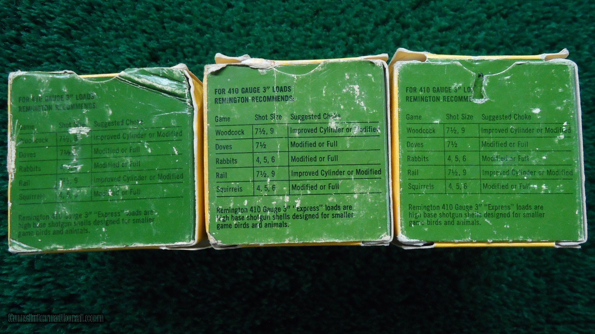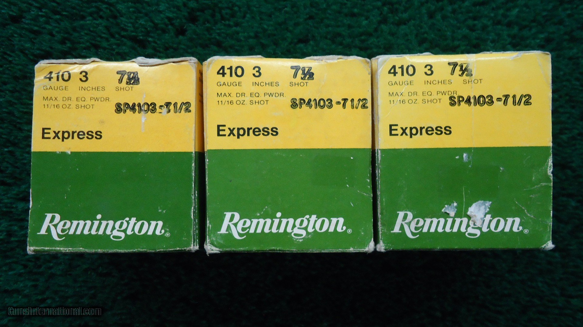 Description: 3 full boxes of Remington 3 inch Extra Long Range Express 410 shells. 25 rounds each. For a total of 75 rounds. Free Shipping on Hard To Find .410 Shells. Leroy Merz Antique Firearms specializes in antique and vintage Winchesters and other fine American firearms. Since 1965 Mr. Merz has taken part in the world of firearms and has been a contributor to many well known reference books. We have hundreds of additional guns in every price range at our home online. Search for Merz Antiques in google. SOLD Shotgun Gauge: .410 Gauge |
