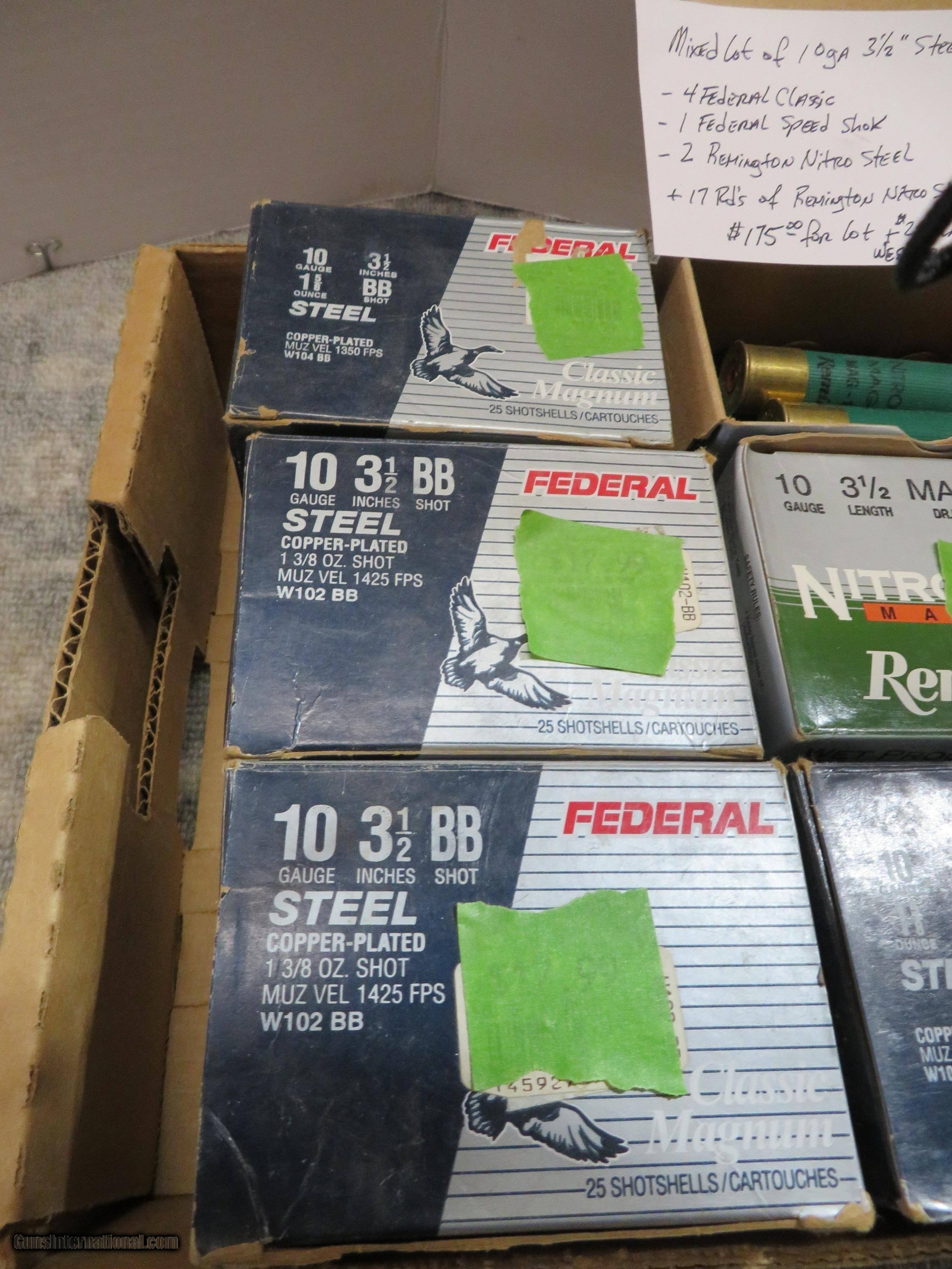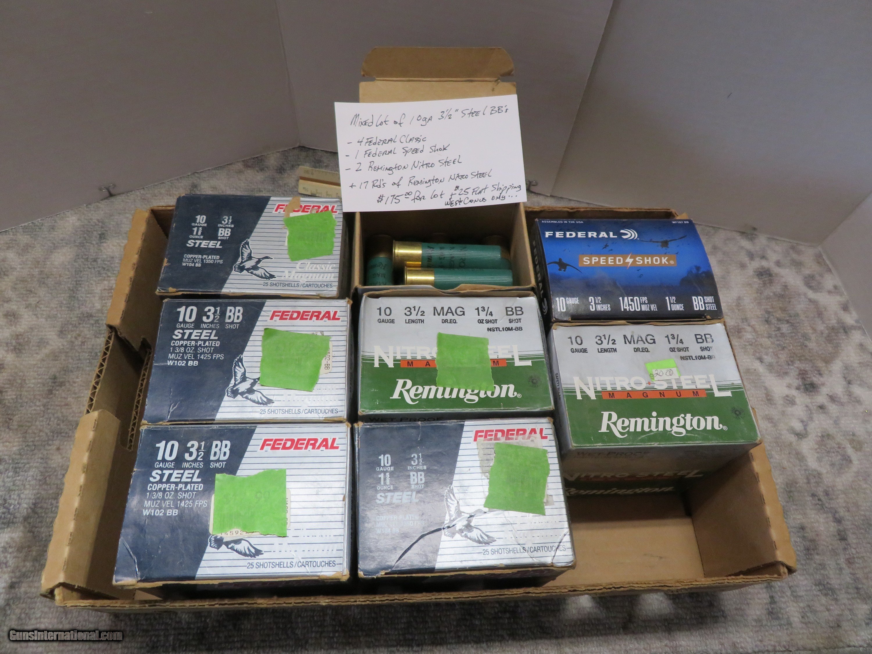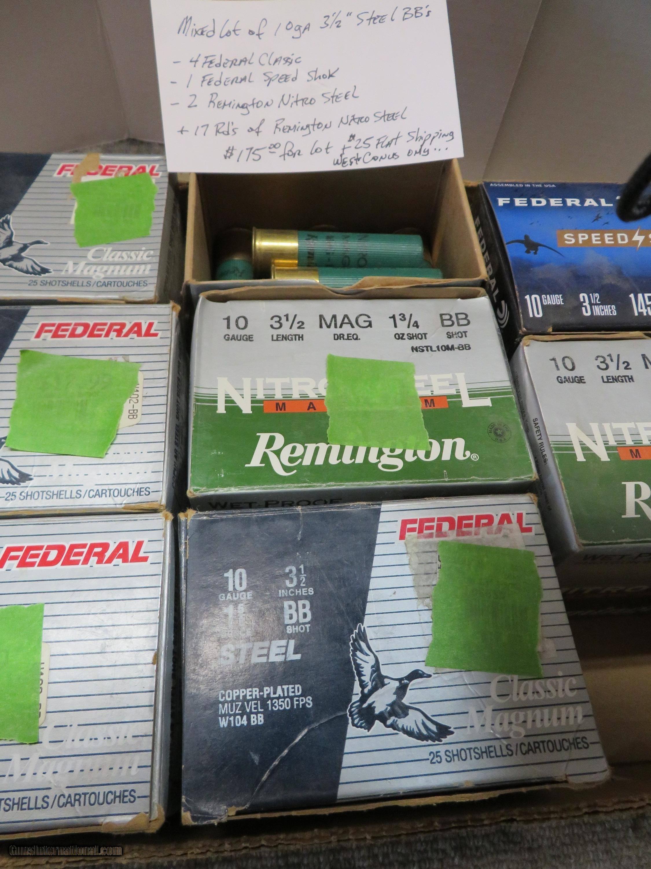 Description: Seven plus boxes of 10 ga 3 1/2inch steel BB's. Four 25 round boxes of Federal Classic, One 25 round box of Federal Speed Shok, Two 25 round boxes of Remington Nitro Steel, plus 17 loose rounds of Remington Nitro Steel. A total of 192 rounds of 10 ga 3 1/2 inch duck/goose medicine...all for one price of $175 plus $25 flat rate shipping ($200 total) to CONUS only. This is a miscellanous lot of left over 10 ga rounds. I am getting too old to shoot all the ammo I have stashed away over the years. Hope that you can use them... Reasonable offers considered...do not be afraid to ask...I might say Yes... SOLD Shotgun Gauge: 10 Gauge |