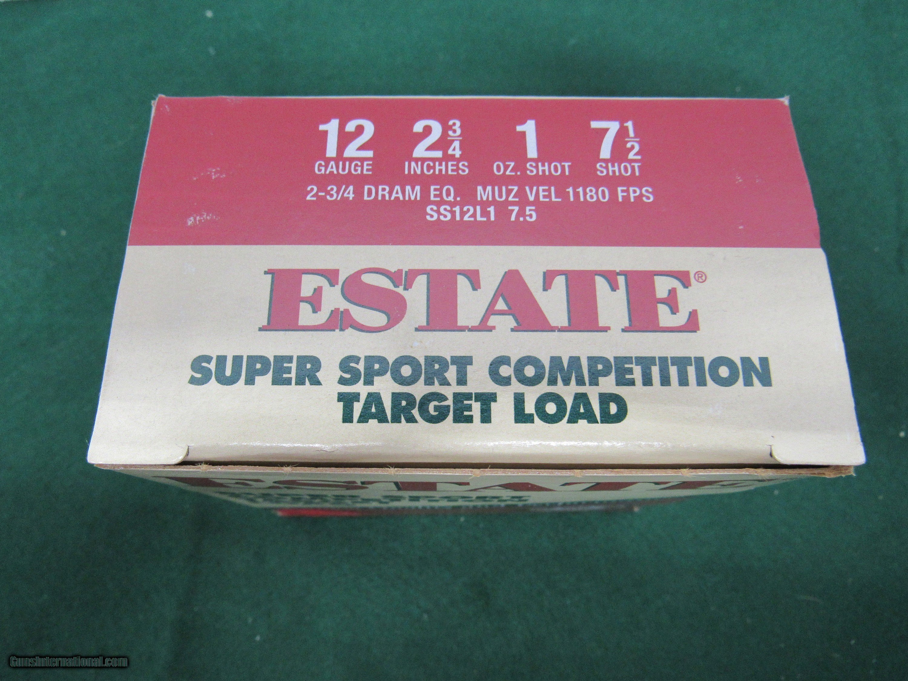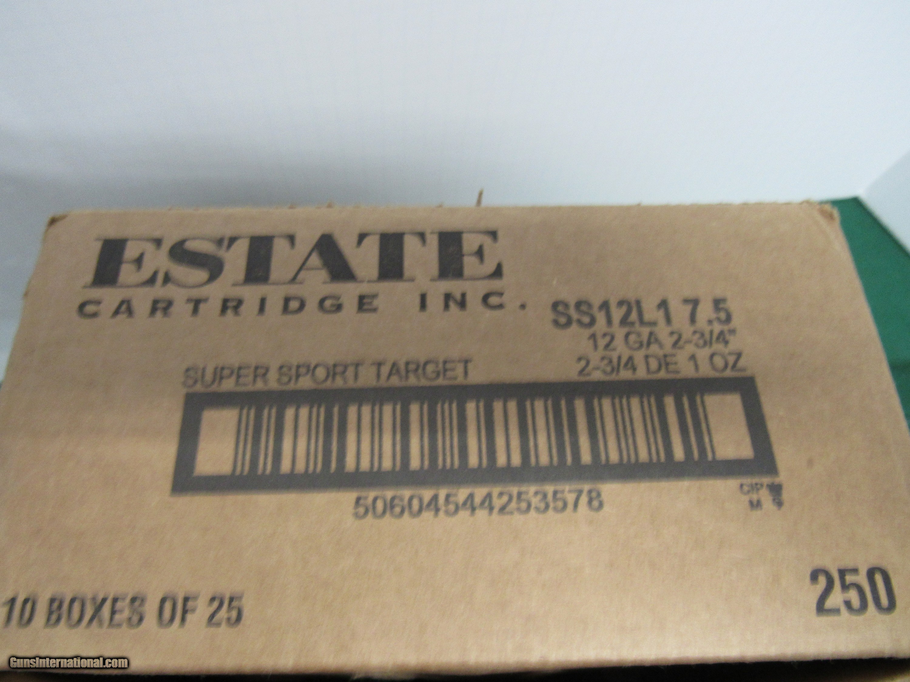 Description: 12 Gauge 7.5 Shot Ammunition - 1oz - 2 3/4 inch - Estate Cartridge - (1) sealed case of 10 boxes x 25 Count per box - Total 250 Rounds $20.00 SHIPPING TO LOWER STATES NO AMMO SALES TO STATES OF AK, CA, HAWII, OR ANY OTHER AMMO RESTRICTED AREAS SOLD |