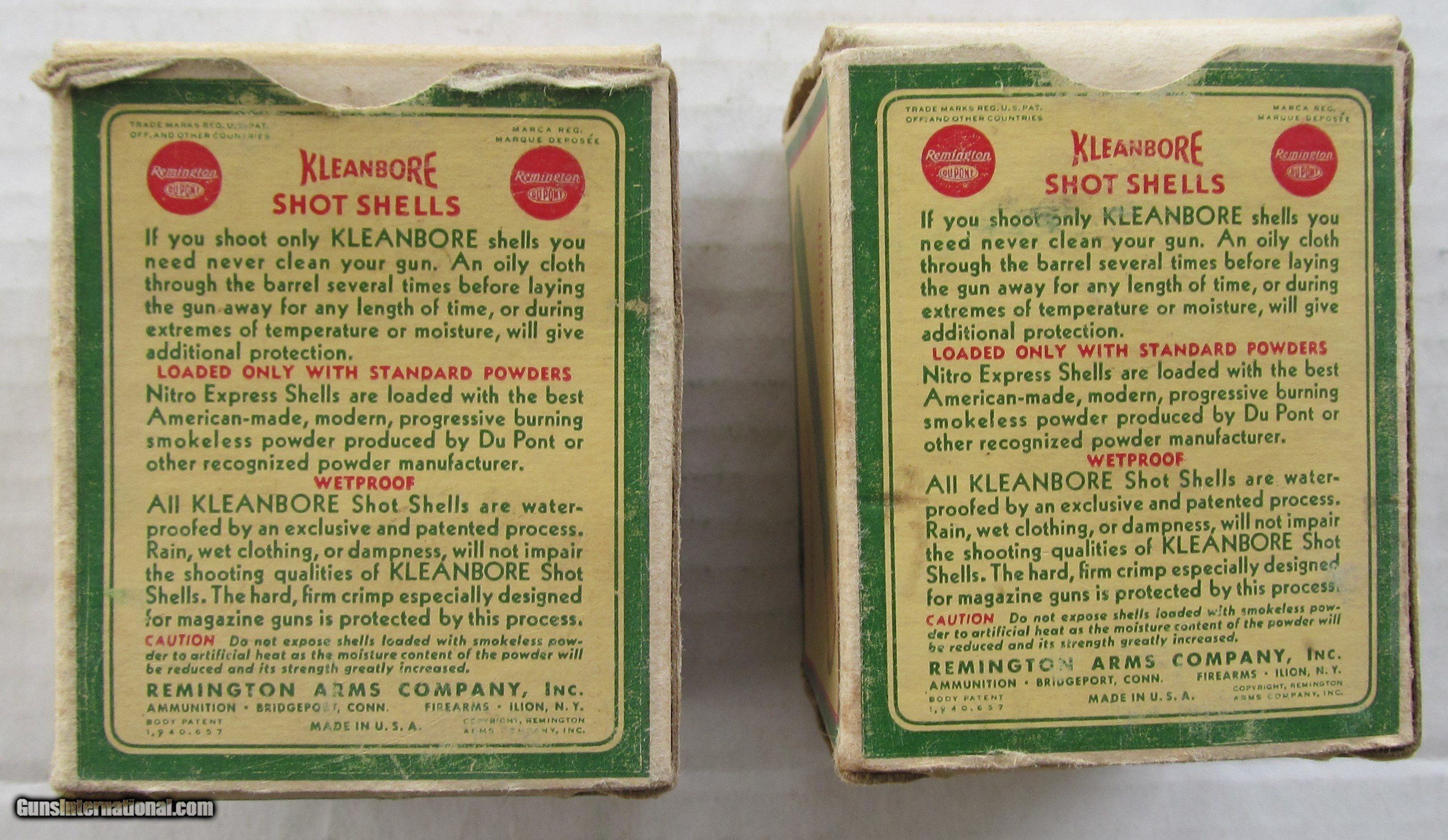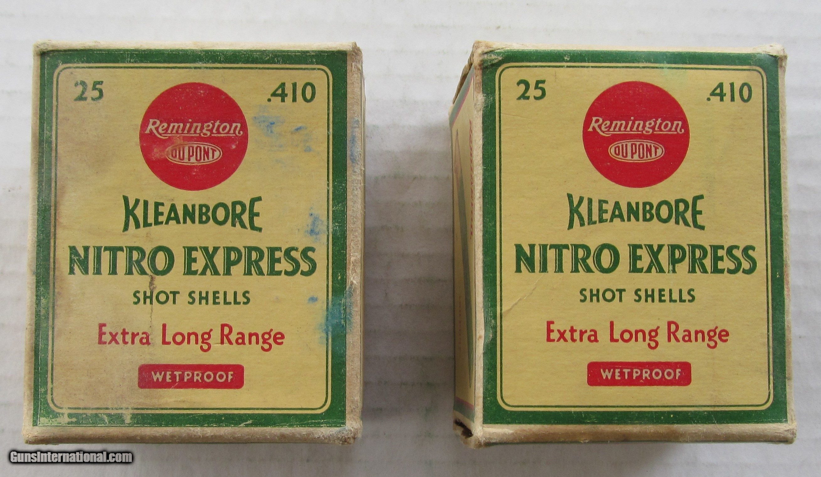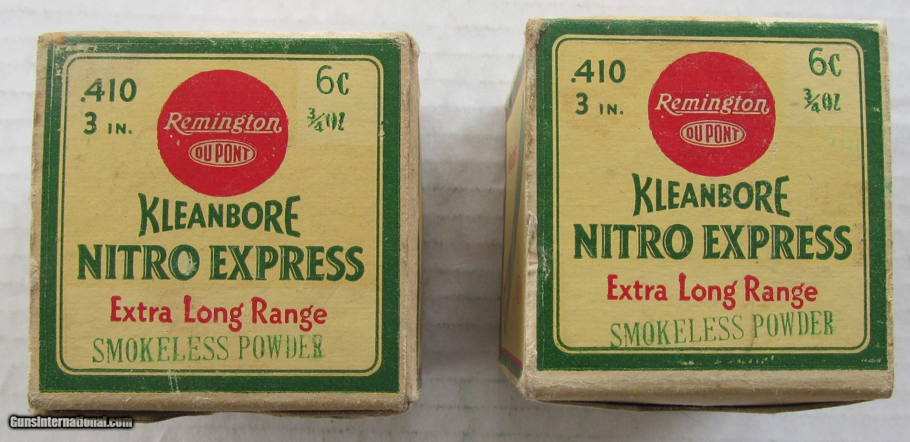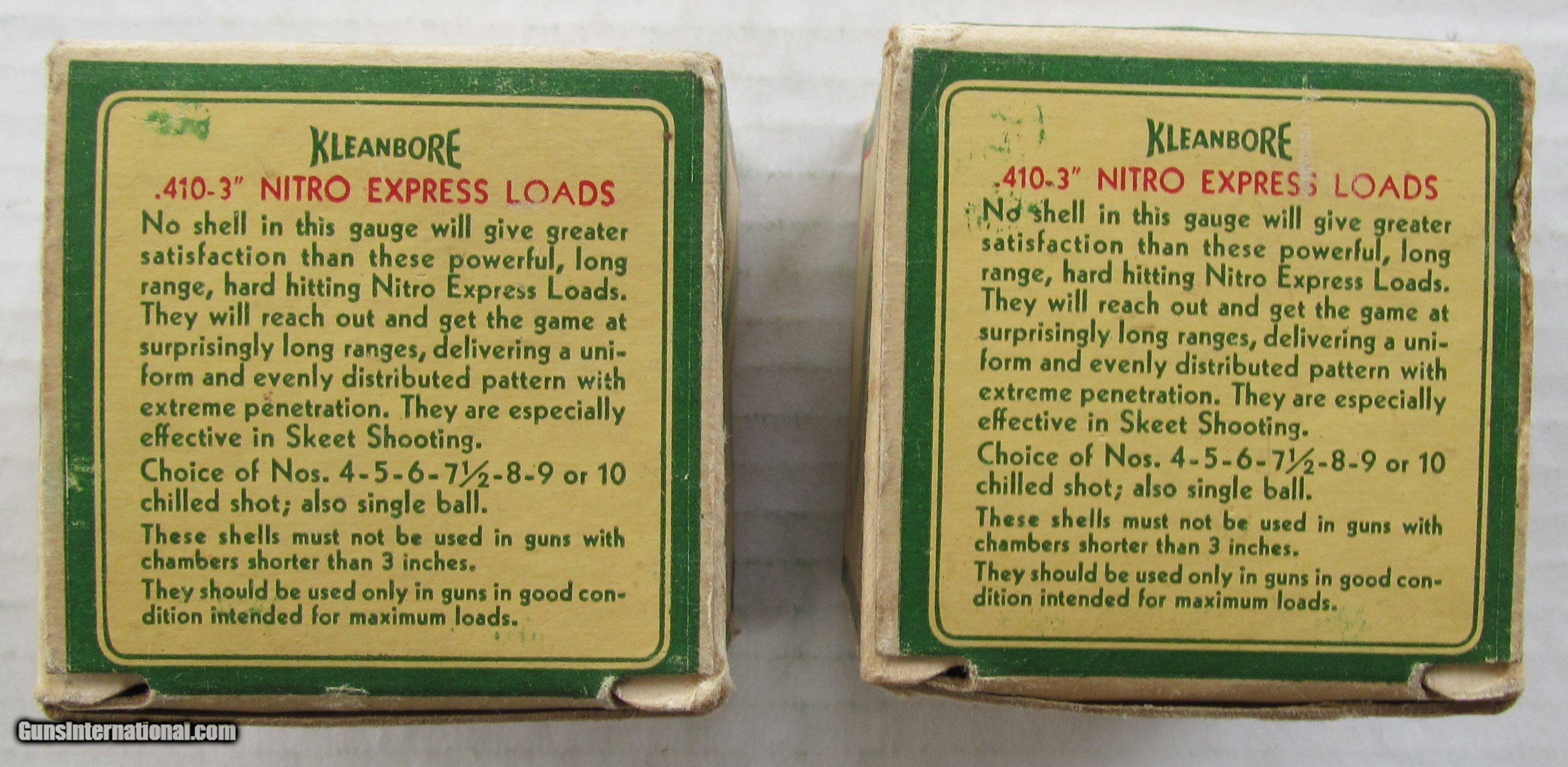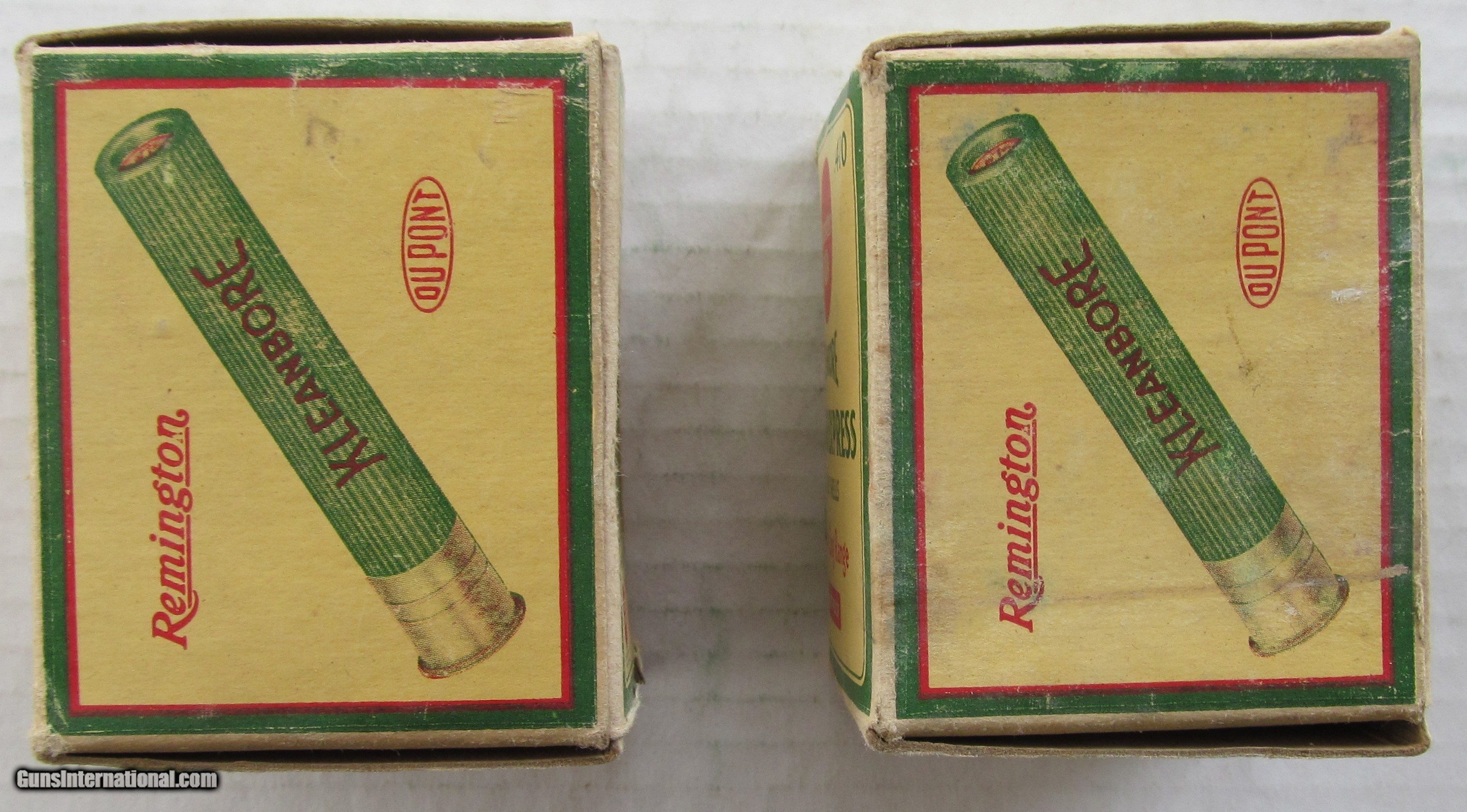 Description: Two full boxes of Remington Kleanbore Nitro Express 3 Inchs shells #6 Chill, the one on the right is somewhat nicer that the left one. No seam splits or torn flaps. $55.00 for both and add $15.00 for UPS ground shipping to USA CONUS 48. Please email me if you want them or if you have a question about them. You must be legal to have these shells and legal for me to ship them to you, please know your local and state laws regarding ammunition. Thank You SOLD Shotgun Gauge: .410 Gauge |