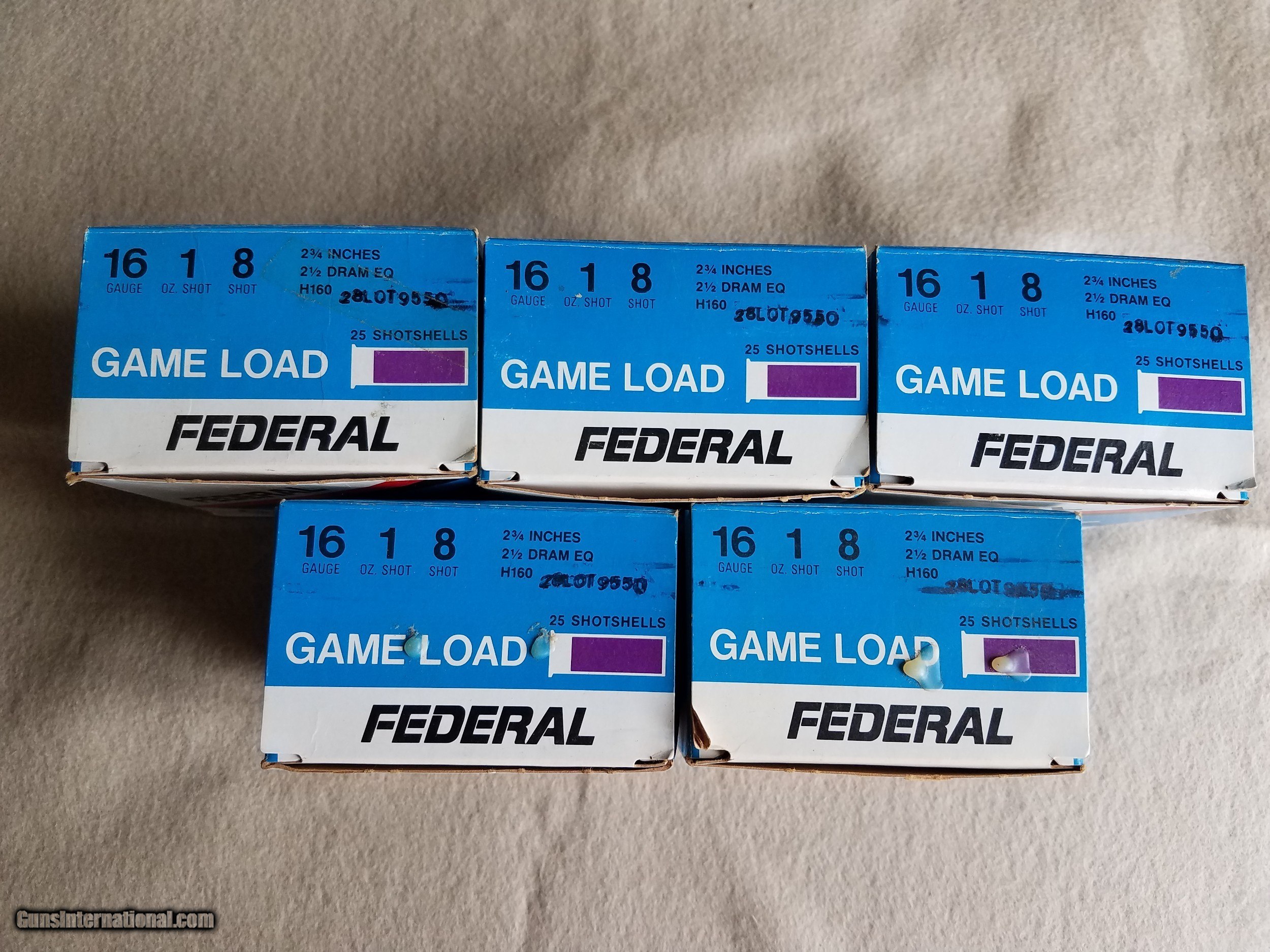 Description: SOLD--SOLD - - Offered for sale here, are 5 pristine boxes (125 rounds) of Federal, 16 ga. 2 3/4 in.,1 oz., #8 shotshells, 2 1/2 Dram Eq. SOLD Shotgun Gauge: 16 Gauge |