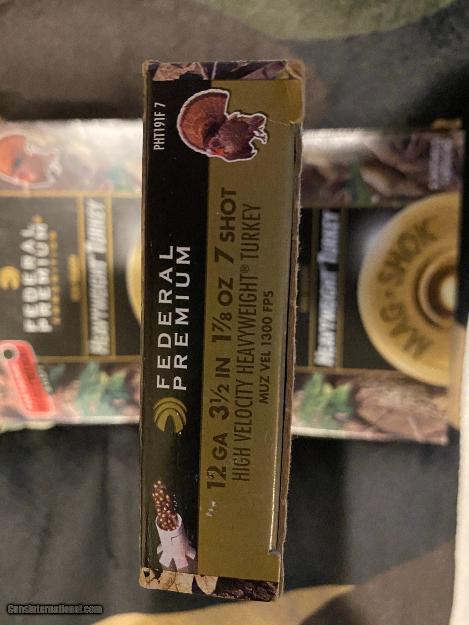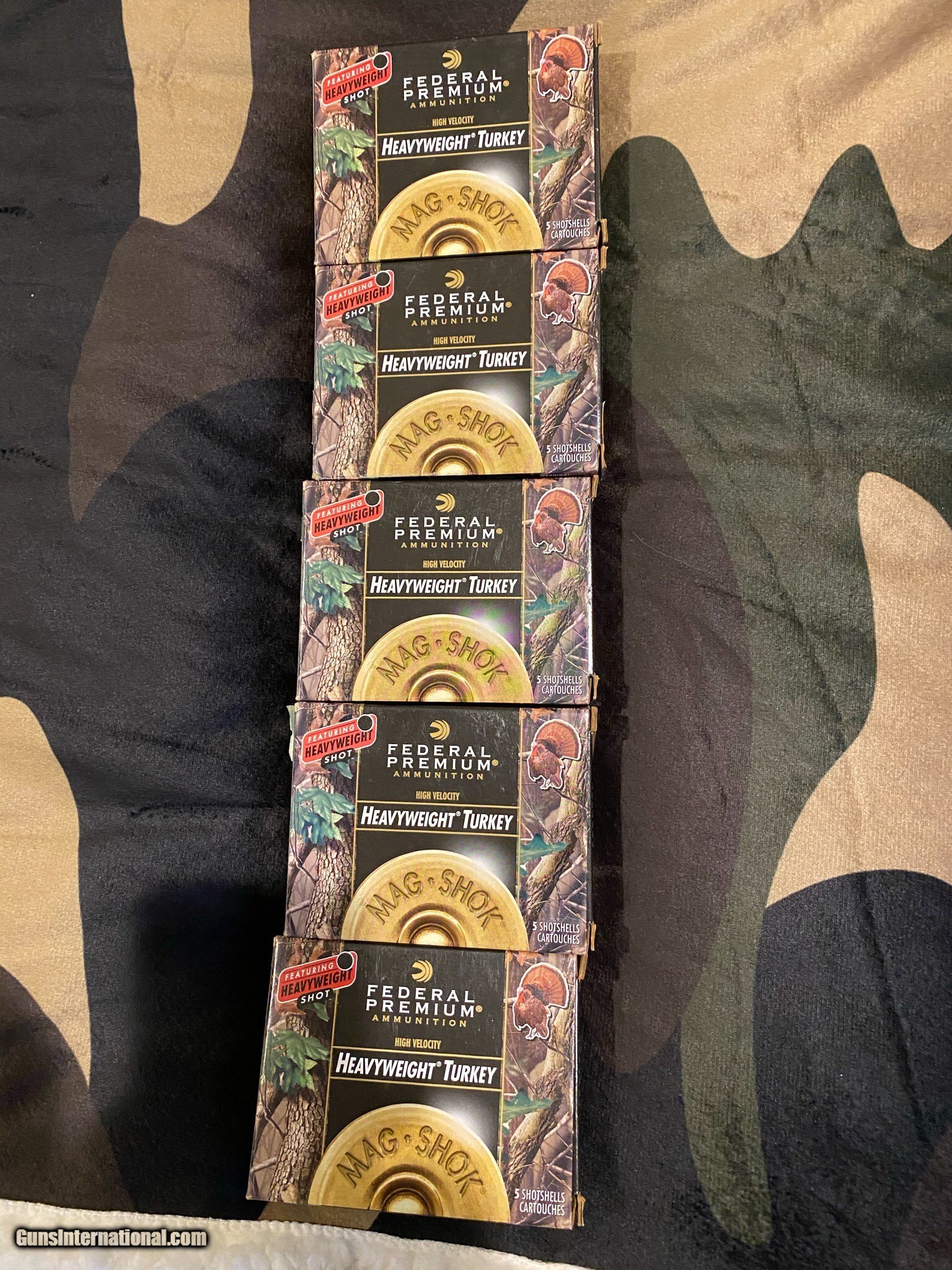 Description: Federal Heavyweight Turkey Loads, 12 ga, 3.5 inch, 1 7/8 oz , number 7s. Five full boxes of 5 shells, new, $125 plus $10 shipping. SOLD |