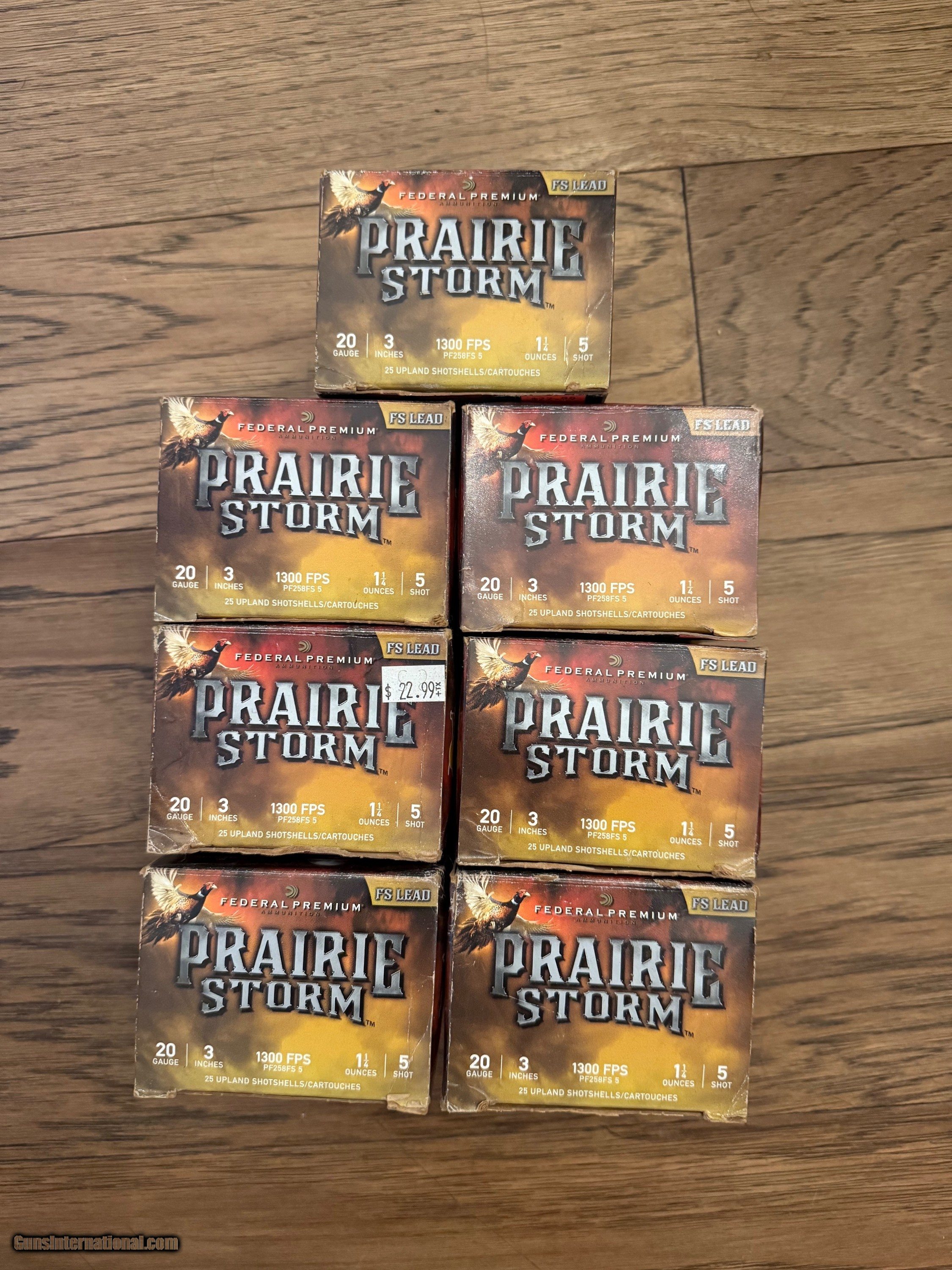 Description: I have 7 boxes of Federal Prairie Storm 20ga #5 3" shot shells. All 7 are only $200 plus shipping cost. Shotgun Gauge: 20 Gauge Price: $200.00 Shipping: $25.00 Pay with