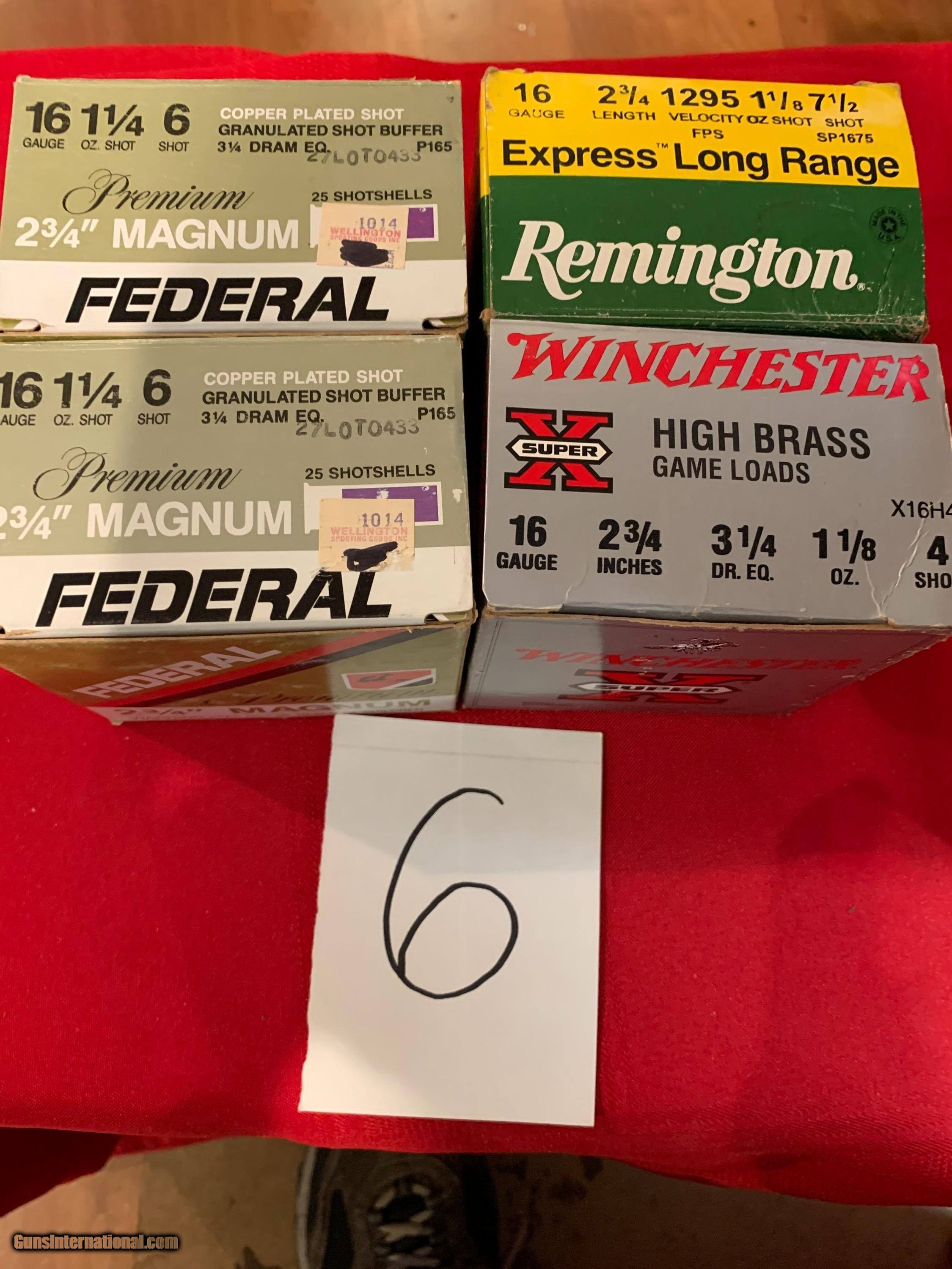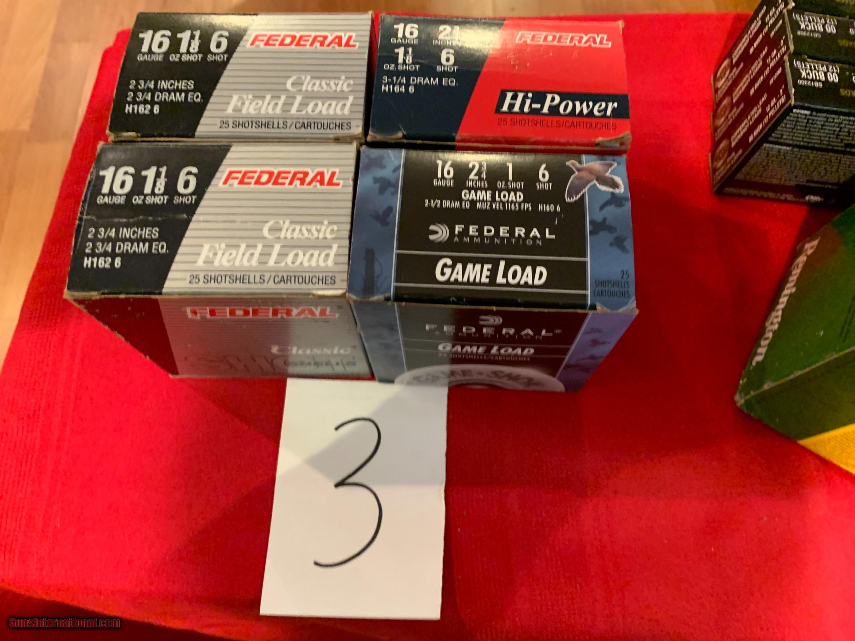 Description: 4 boxes of 25-- 16 ga. #6,#4,#7 1/2. $125 4 boxes of 5-- Winchester 3" 12 ga. 00 buck $75 4 boxes of 25 Federal 16 ga #6 $100 2 boxes of 10 Kent Inpact 16 ga. #5 $100 SOLD Shotgun Gauge: 12 Gauge, 16 Gauge |
