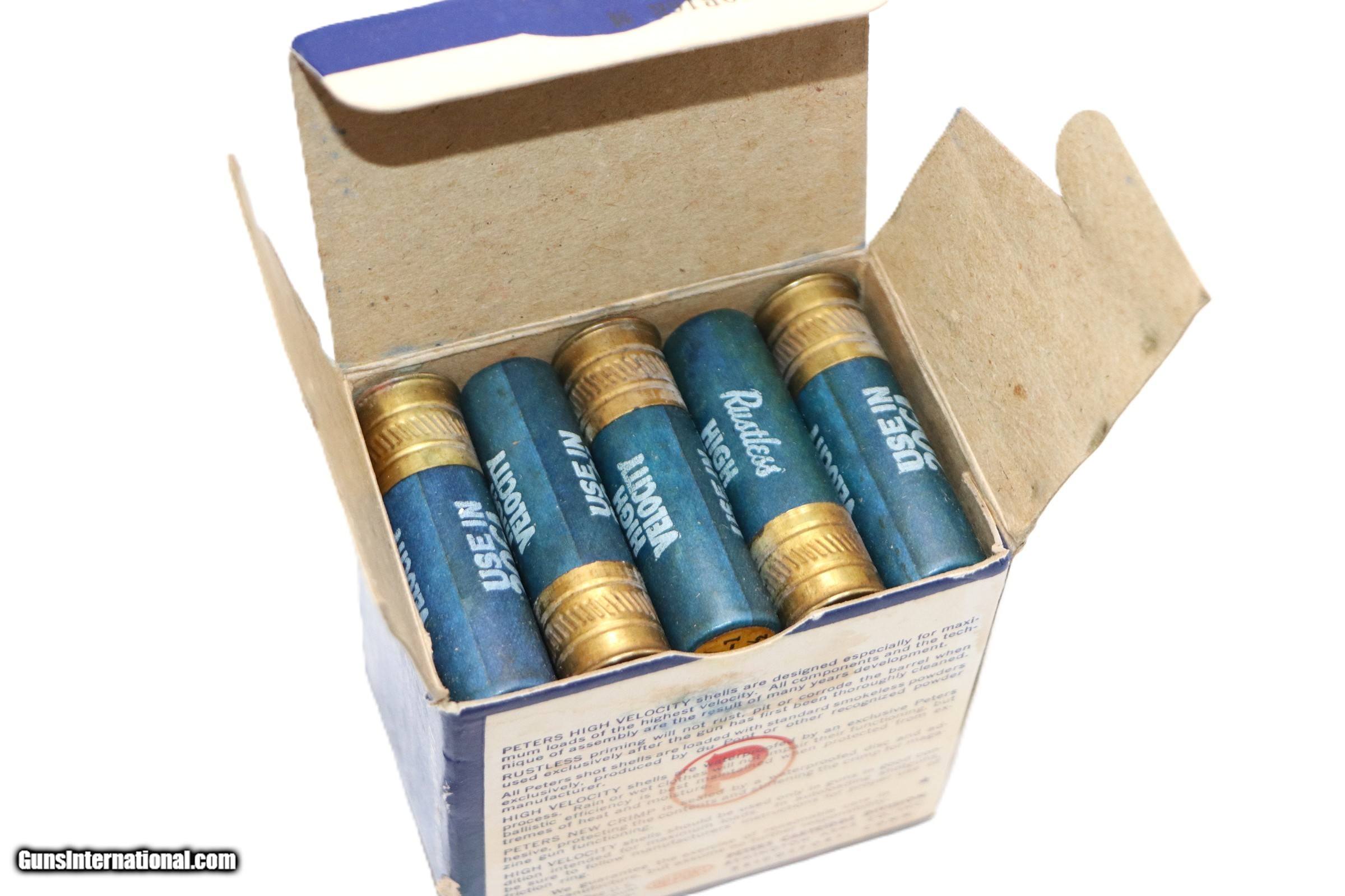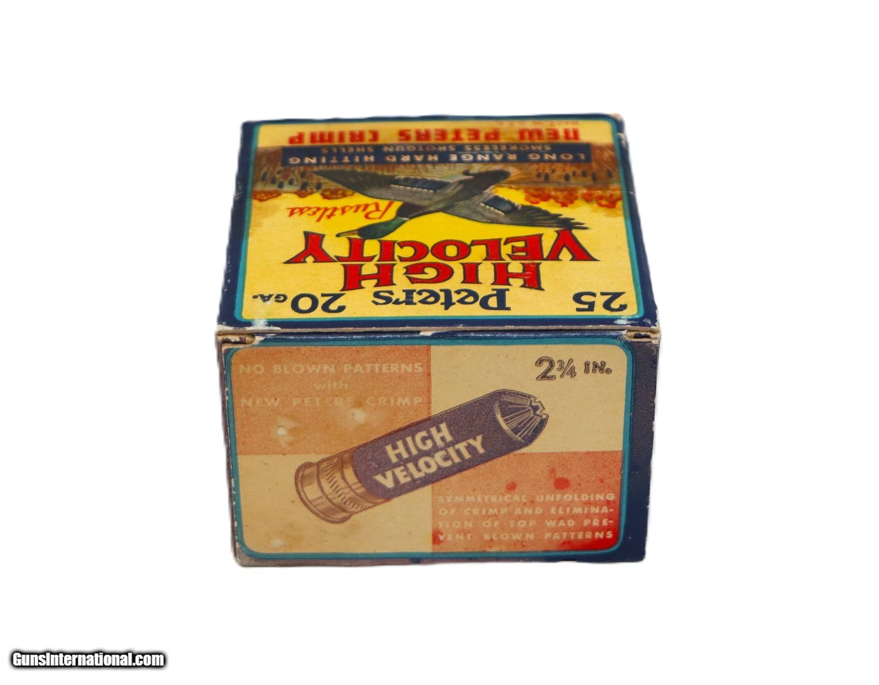Description: Peters Cart. Co., High Velocity, New Peters Crimp, 20ga., 1pc., Full, shot size 7 1/2, box has minor age soiling & light corner wear, color fade on top panel, paper shells are excellent. Shotgun Gauge: 20 Gauge Price: $68.00 Contact Seller |