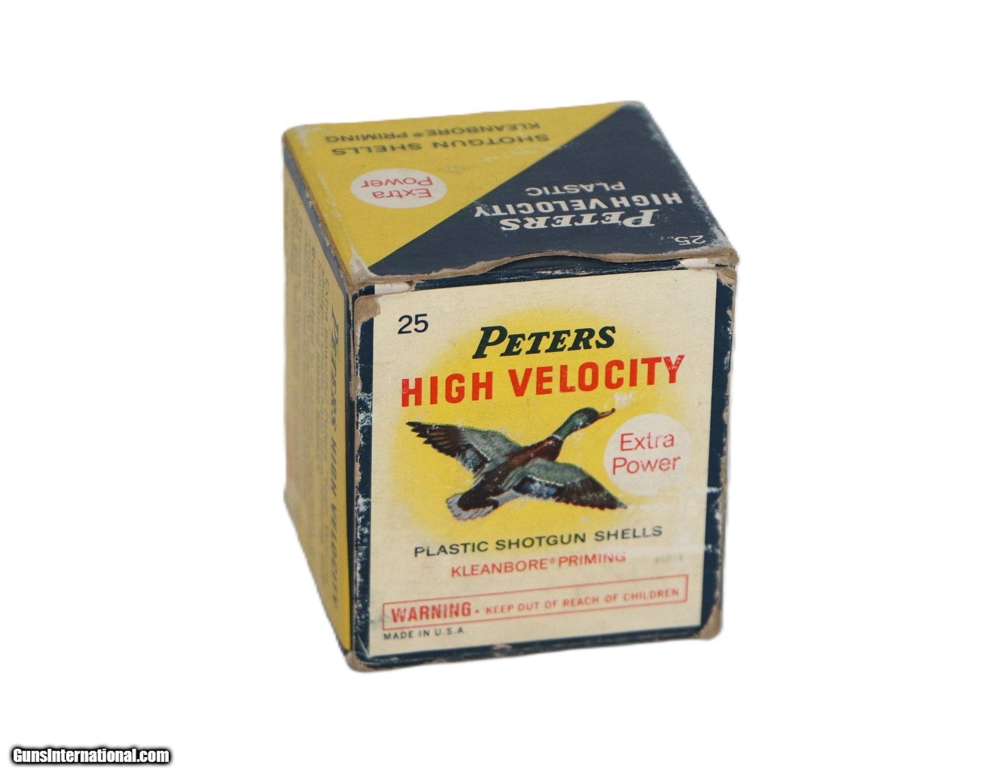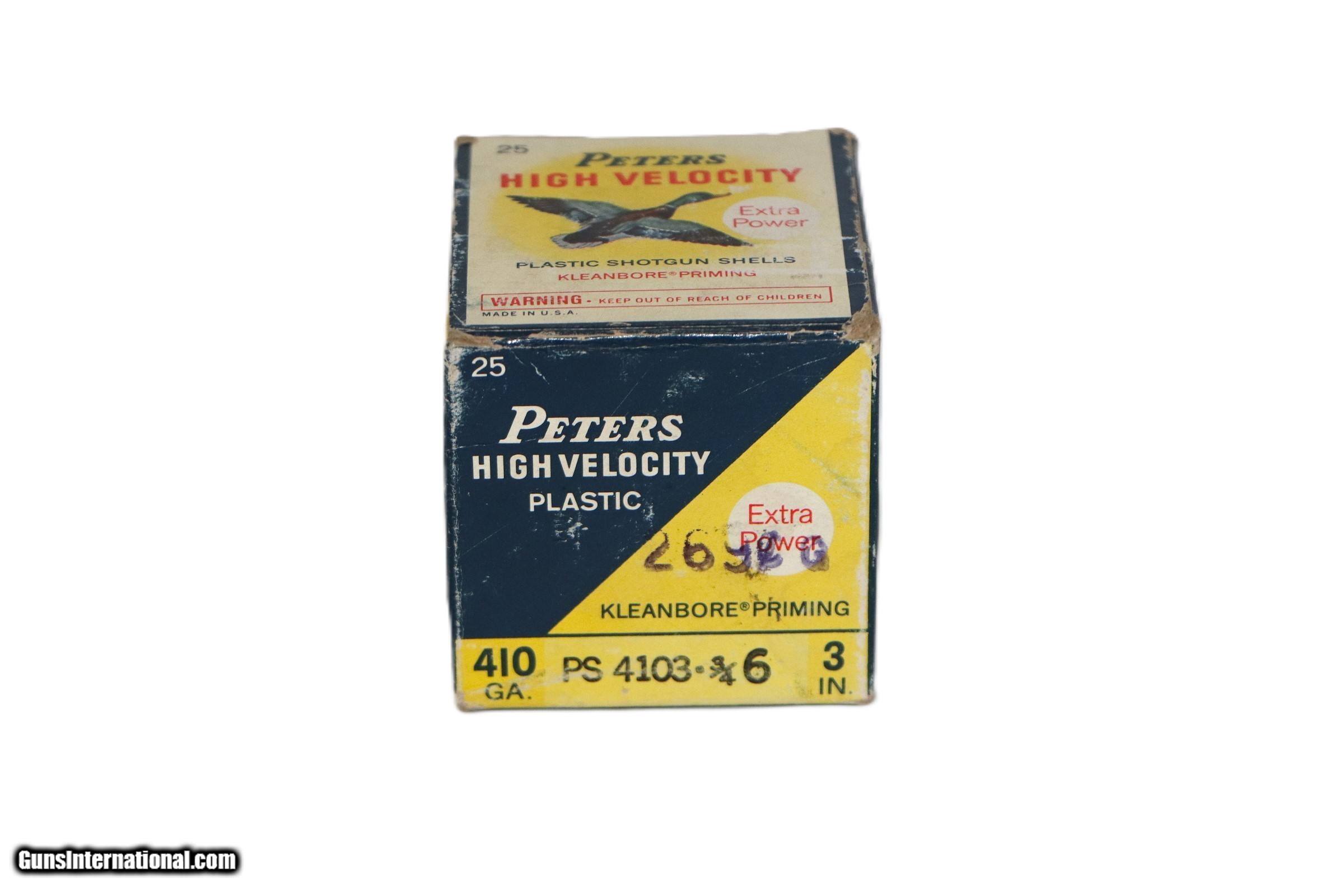 Description: Peters, High Velocity, 410 Gauge, 3", Shot Size 6, 25 shells in excellent condition. Box is VG with scuffing and edge wear. Add 13.50 S+H SOLD |