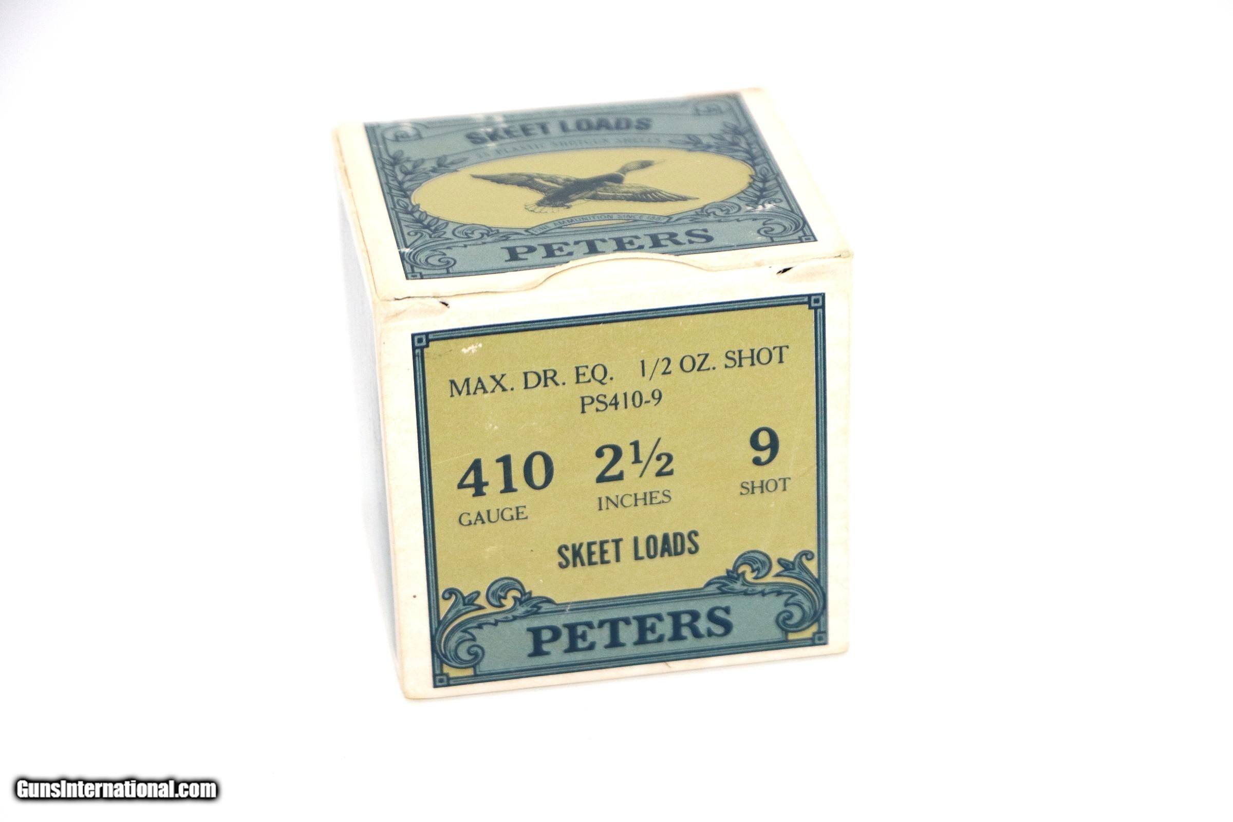 Description: Peters Skeet Loads, 410ga., 1pc., shot size 9, 2 1/2'', plastic shells are excellent. Shotgun Gauge: .410 Gauge Price: $55.00 Shipping: $12.50 Contact Seller |