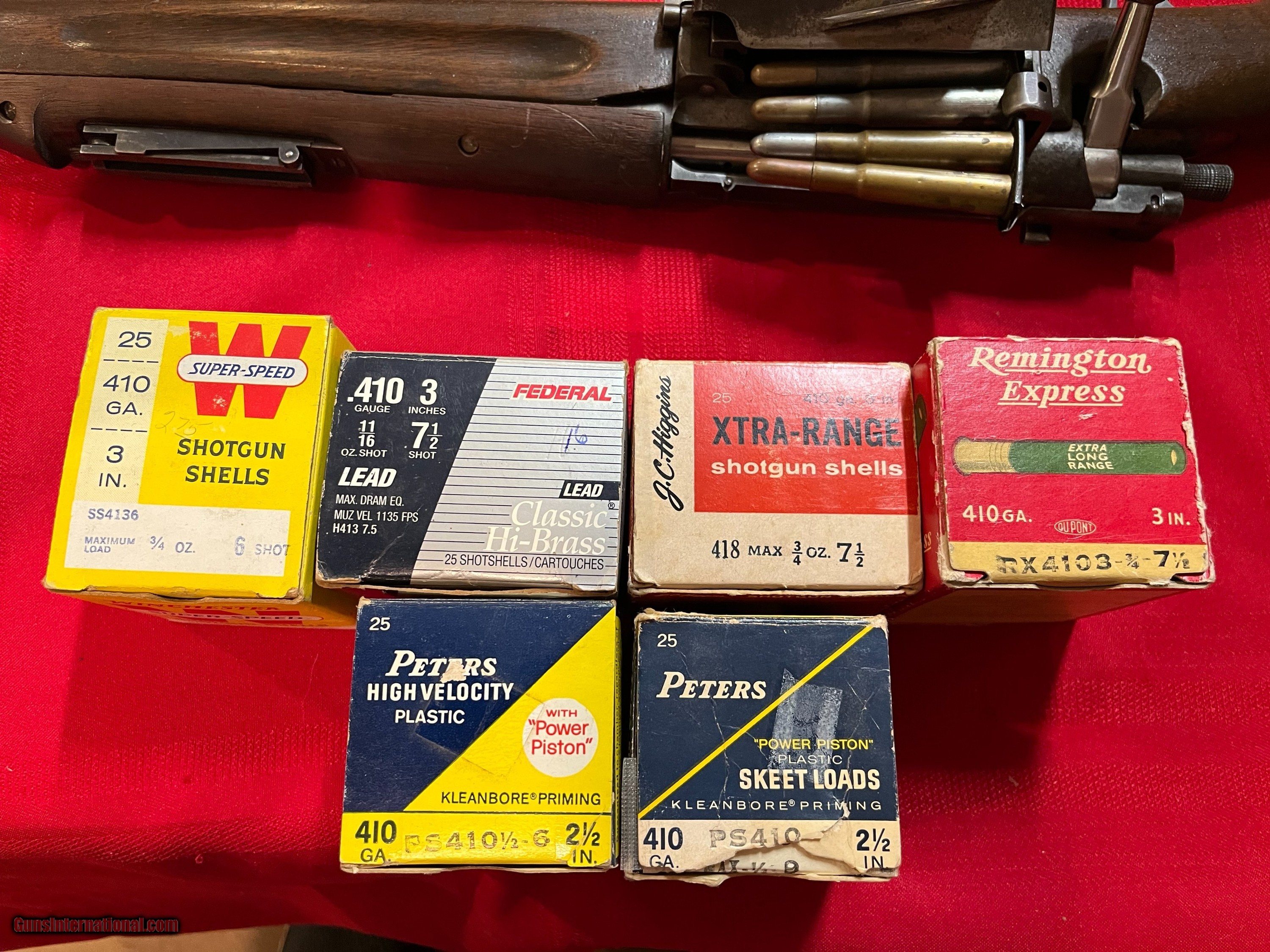 Description: 1 box Winchester 410 3" paper #6 21 pieces 1 box Federal/ Remington 3" # 7 1/2 plastic 25 pieces 1 box J C Higgins 3" # 7 1/2 paper 24 pieces 1 box Remington 3" # 7 1/2 paper 25 pieces 1 box Peters Skeet 2 1/2" plastic #9 15 pieces 1 box Peters 2 1/2" plastic #6 20 pieces SOLD Shotgun Gauge: .410 Gauge |