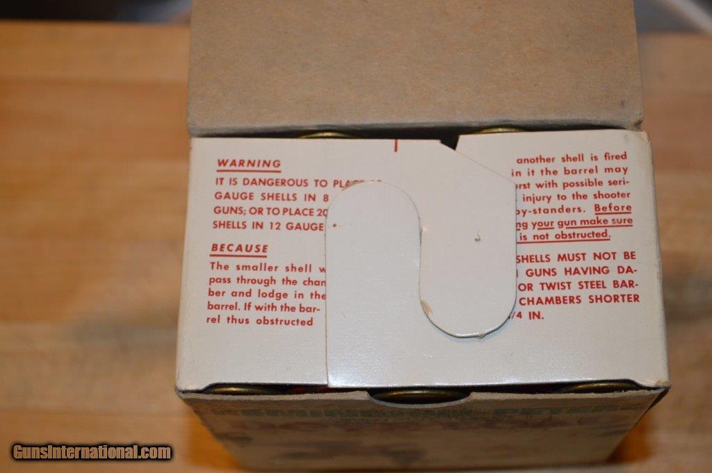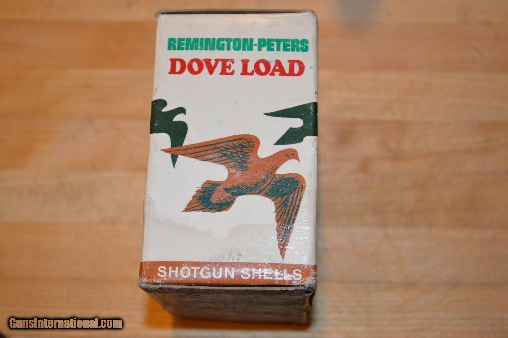 Description: This is a box of vintage Remington-Peters12 ga. Dove loads shot shells. This is an early box that contains all 25 original rounds. This one piece box is beautiful and unique. It has been carefully opened and remains in very good condition. Colors are bright; highly legible. Ammunition is in its original form and has been untouched. SOLD |