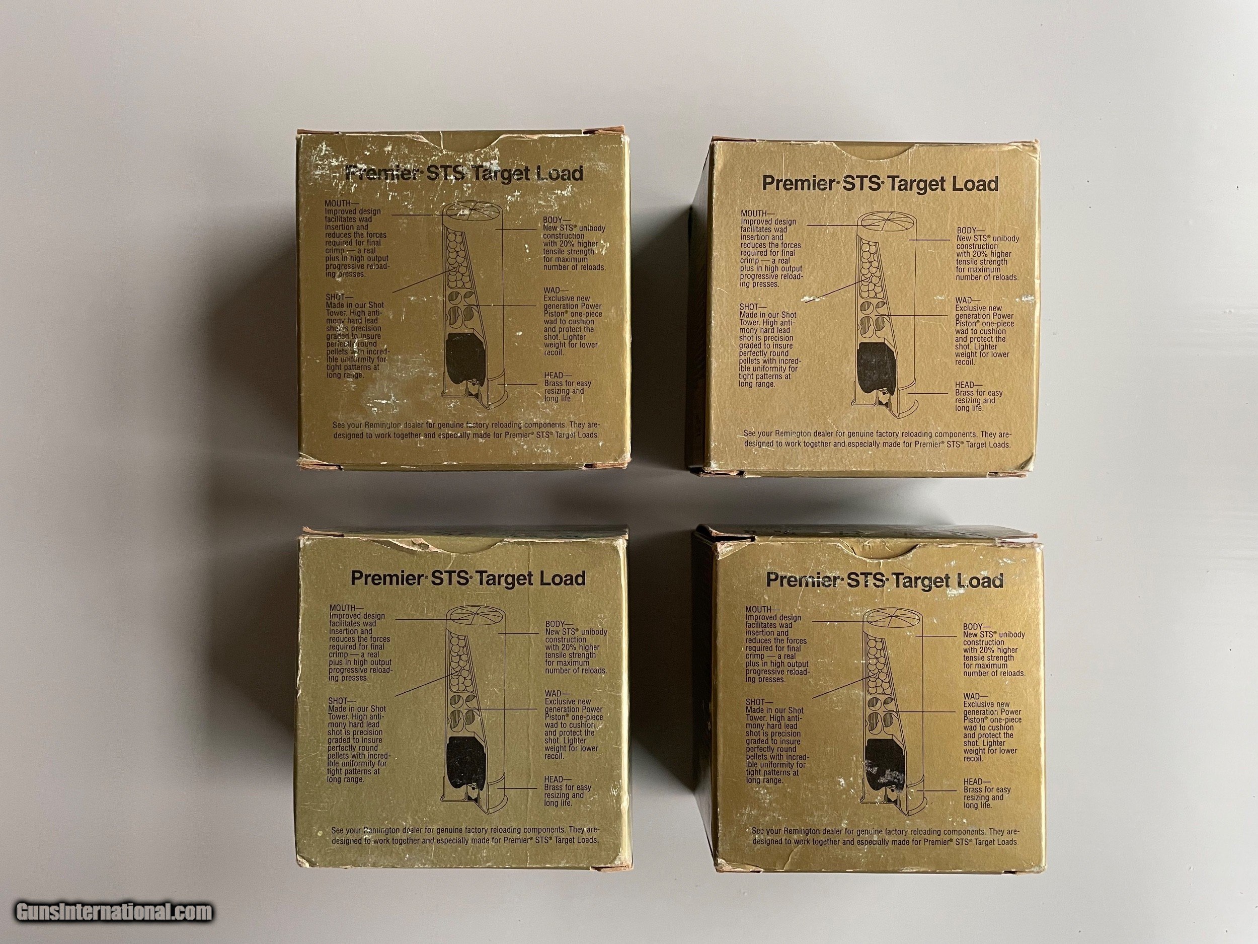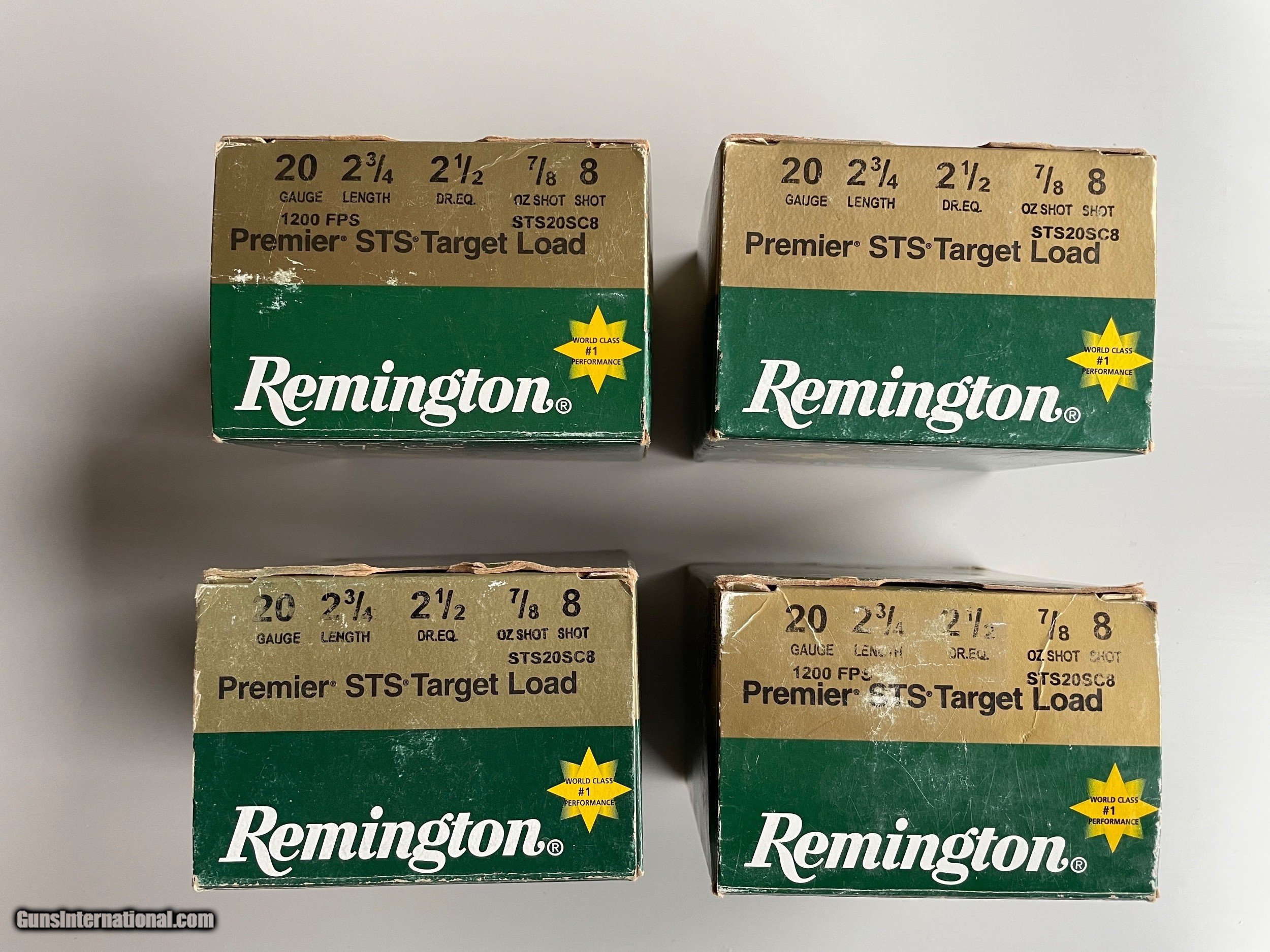 Description: Remington Premier STS 20 Gauge Ammo 2 3/4" 7/8oz. #8 Shot Target Load - 4 boxes (100 rounds) This listing is for 4 boxes as shown, for 100 rounds. Price includes ground shipping. SOLD Shotgun Gauge: 20 Gauge |