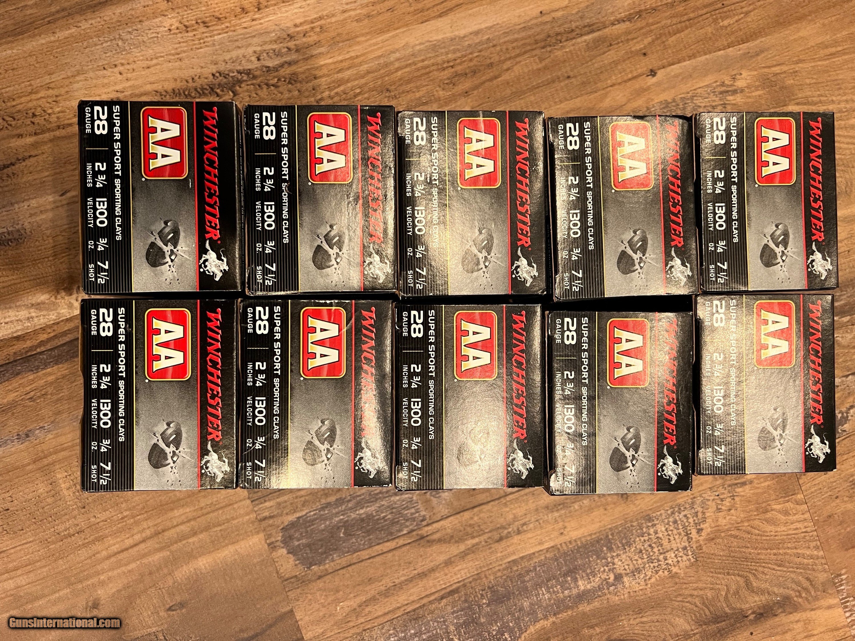 Description: Winchester AA sporting clays 28ga 1300fps 7/8oz 7.5 shot. 250 round case shipping included in cost SOLD Shotgun Gauge: 28 Gauge |