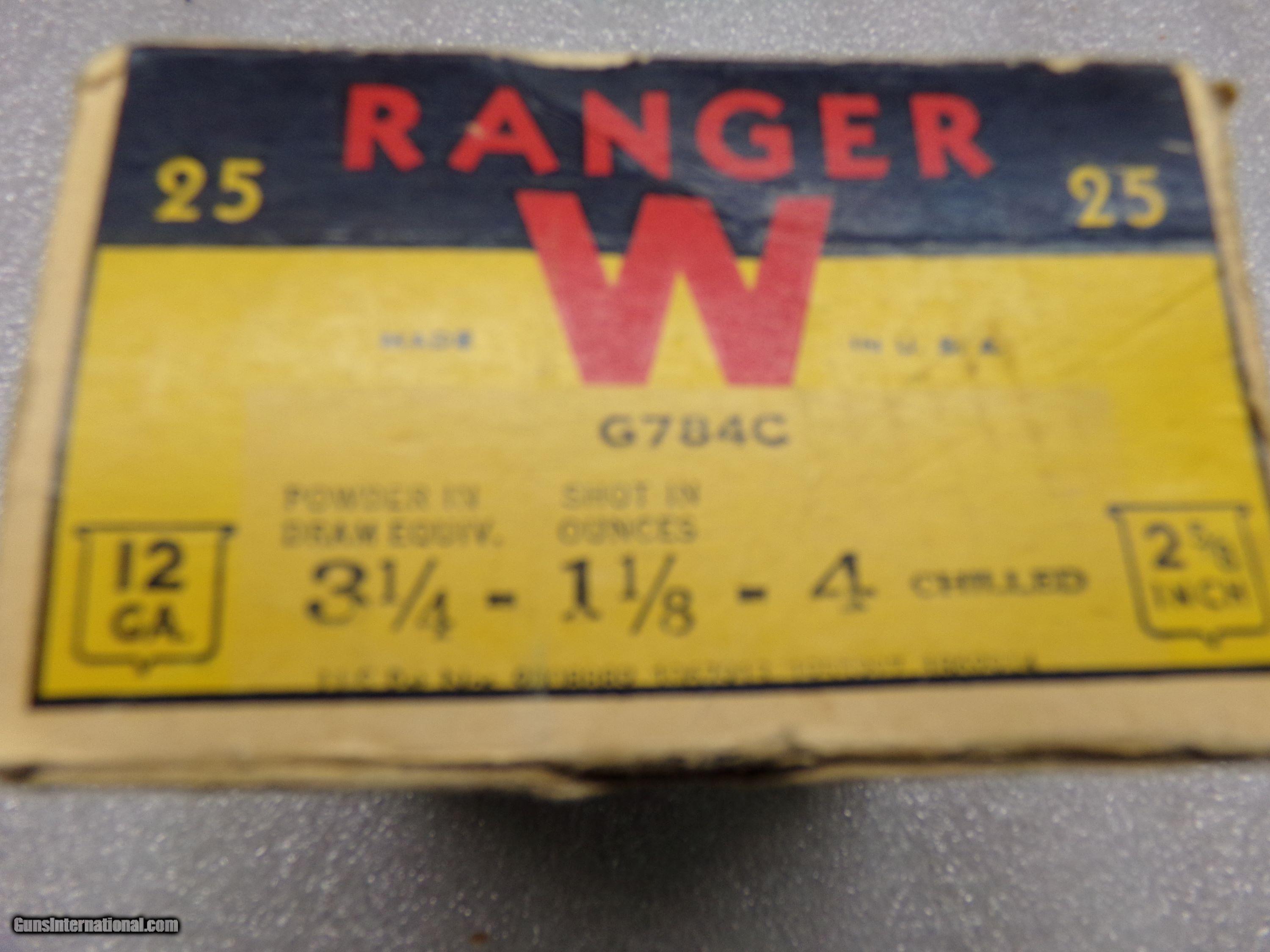 Description: Winchester Ranger 12 Ga. Box of 25. 3 1/4-1 1/8-4 chilled. Box is missing 1 flap under lid. Free Shipping, No Calif. Sales. thanks SOLD |