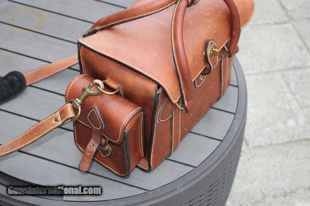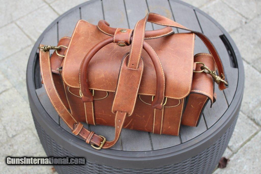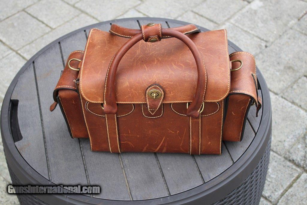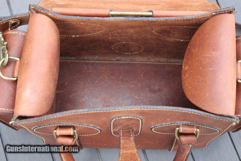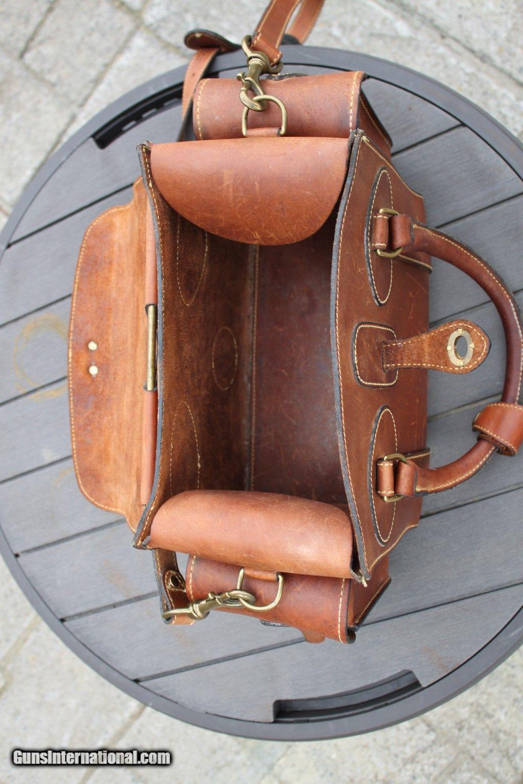 Description: SOLD! Very nice deluxe Mulholland Brothers Leather Range bag. Double handles, shoulder strap, two exterior pockets and a nice clean interior. Ouside dimensions are 15" X 9". This is a very well made bag in excellent slightly used condition. Please see pictures for accurate description and condition. SOLD |