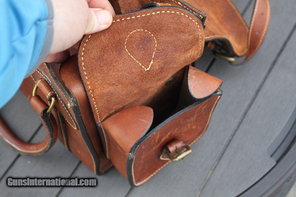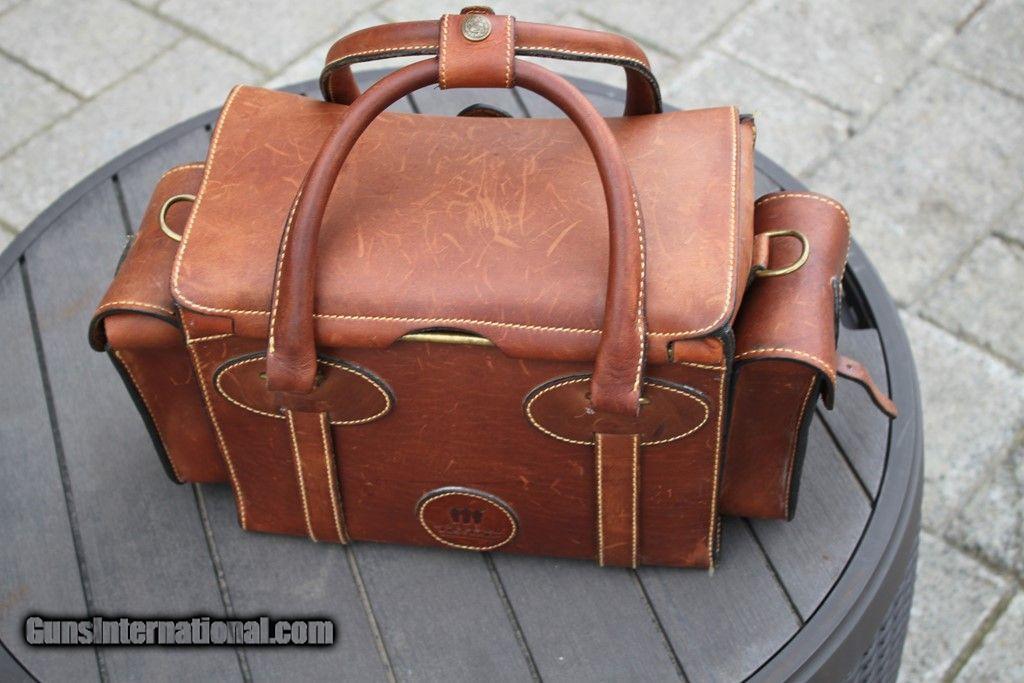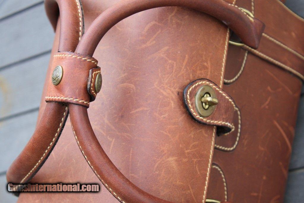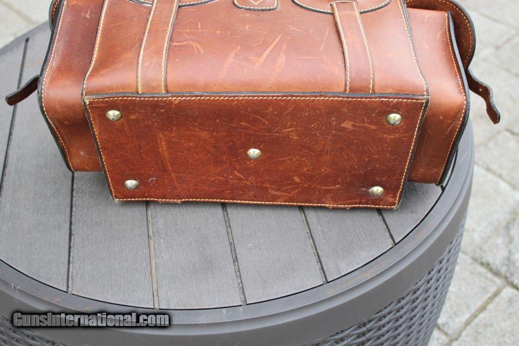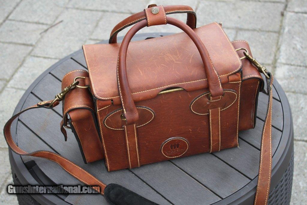 Description: SOLD! Very nice deluxe Mulholland Brothers Leather Range bag. Double handles, shoulder strap, two exterior pockets and a nice clean interior. Ouside dimensions are 15" X 9". This is a very well made bag in excellent slightly used condition. Please see pictures for accurate description and condition. SOLD |