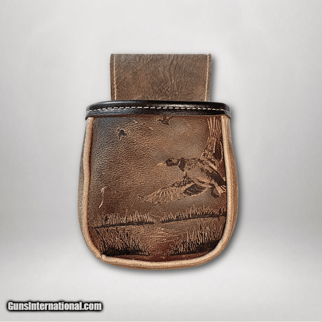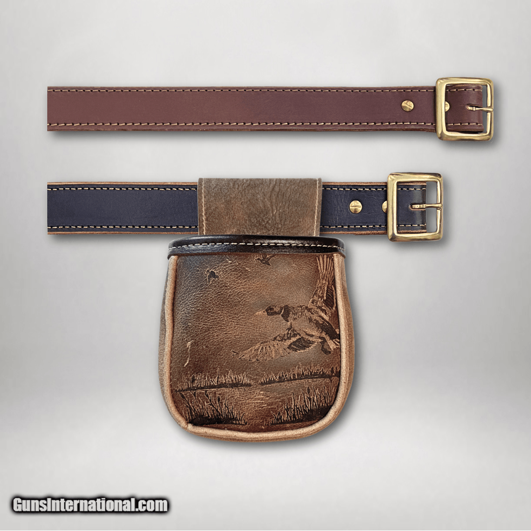 Description: WHAT MAKES LEATHER LINK STUDIO SHOTGUN SHELL BAG SO SPECIAL? It begins with our hand selected quality leathers, sourced from all over the world. You will find pure anilines, hair on hides and embossed leathers with one of a kind patterning. This makes your purchase special along with our attention to detail, beautiful design and affordable pricing. Leather Link products are completely unique…hand-crafted in High Point, North Carolina. “ONE OF A KIND…HANDMADE ONE AT A TIME This genuine Solid leather small shotgun shell bag pouch is accented by one of a kind hand grawn ar work . It is the perfect carrying case for sheet shooting or hunting. All rivets are solid brass and trimmed with leather binding. This case has one compartment ITEM: BB-194 Material: 100% Cowhide Leather with handdrawn custom art work Hardware: 100% Solid Brass Outside Dimensions: 6 1/2″ H x 6″ W x 2″ D Belt Information: TO GET THE BEST FIT ORDER WAIST SIZE + 2 This English Bridle leather isn't your ordinary leather. It's thick and hearty. It's stronger and thicker than anything you'll find in a department store. This particular belt is accented with heavy duty nylon stitching. These belts are made to order and crafted with our years of leather-working experience. Each belt is finished with a high grade leather polish to give it a beautiful sheen.