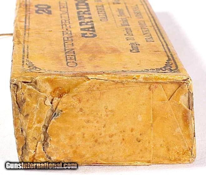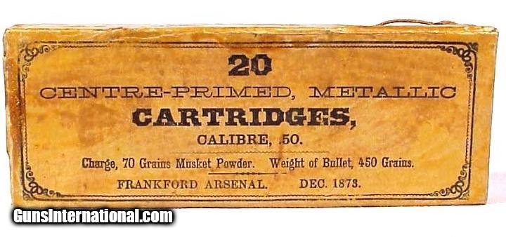 Description: Box of 20 - .50-70 CENTRE-PRIMED METALLIC CARTRIDGES Manufactured by Frankfort Arsenal - Dec. 1873. Partically opened. Rare. Sold as Collectibile/Display Ammunication and not intended to be used in guns. You assume full responsibility for use. SOLD Rifle Caliber: .50-70 Government |