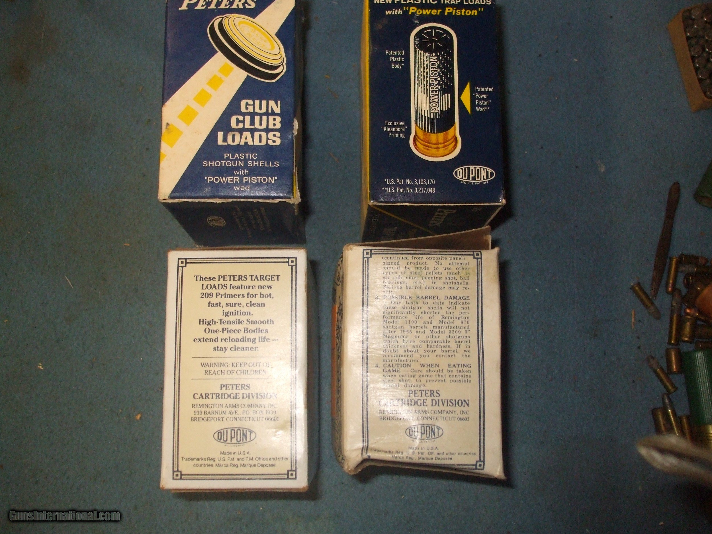 Description: Peters 12ga empty boxes. Assortment of boxes from various time periods produced by Remington under the Peters brand. 1-Peters Blue Magic Target Load. 1-Peters 3" steel shot #2 marked "slightly imperfect not for resale". These boxes were sold to Dupont employees at a discount and rather rare. 1-Peters 12ag trap load box from 1960's. This was Remingtons first plastic target load hull called the All-American and used Power Piston plastic wad as noted on box. 1-Peters Gun Club target load box another rare item. Shipping $10.00 USPS priority mail. SOLD Shotgun Gauge: 12 Gauge |