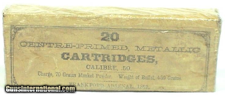 Description: Complete box .50-70 Cartridges made at Frankfort Arsenal, 1869. Sealed Box, string intact. There is some side breaks on sides, but complete. Pre-1870 .50 Cal. Boxes are Very Rare. Made for Sharps & Springfield Carbines & Rifles. SOLD Rifle Caliber: .50-70 Government |