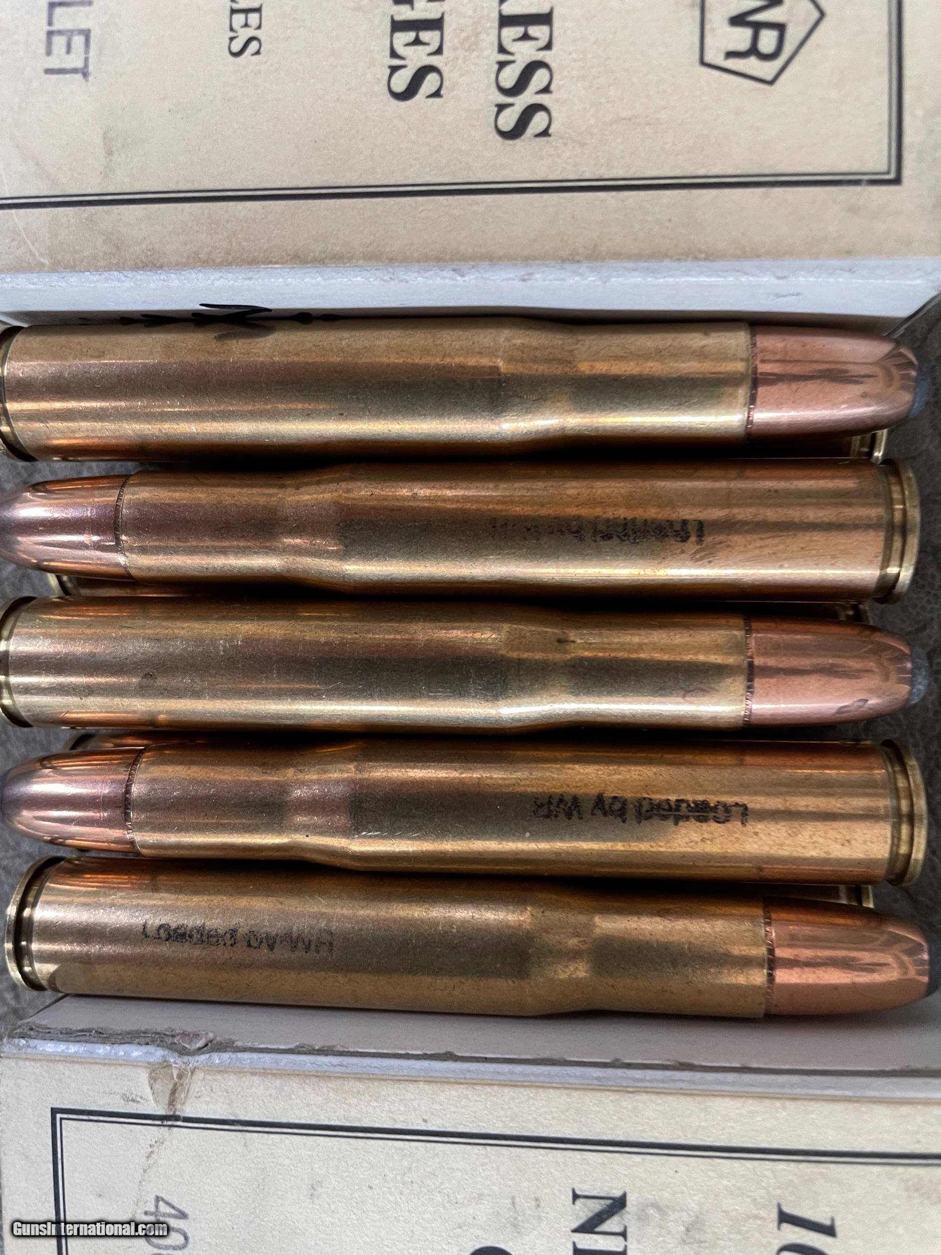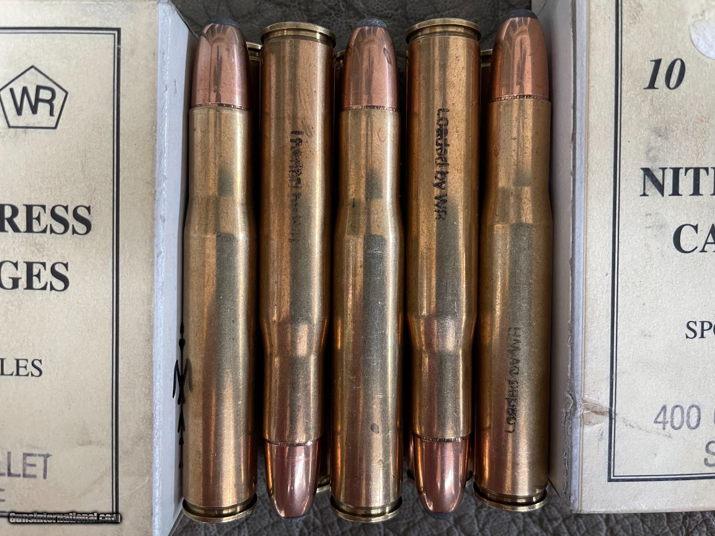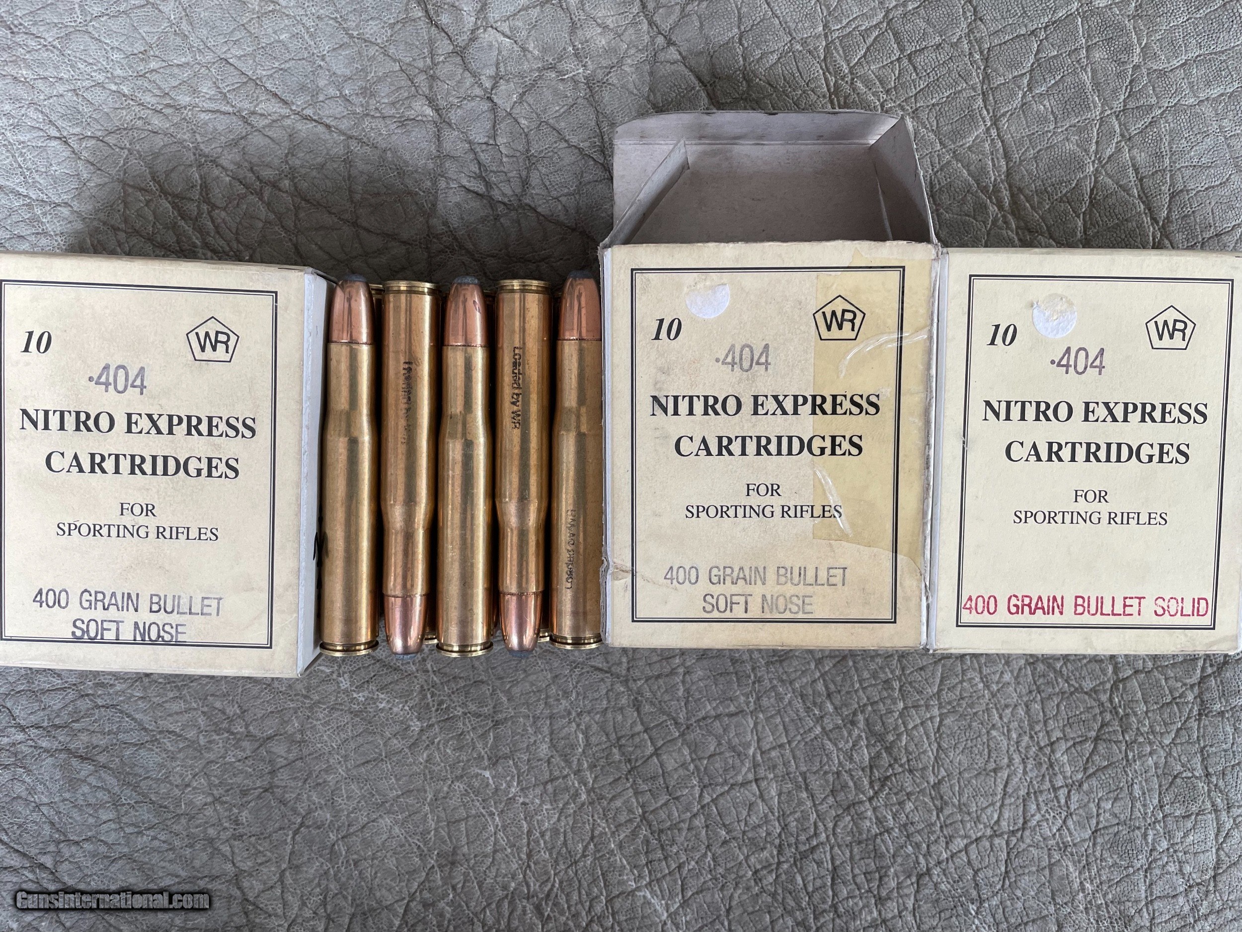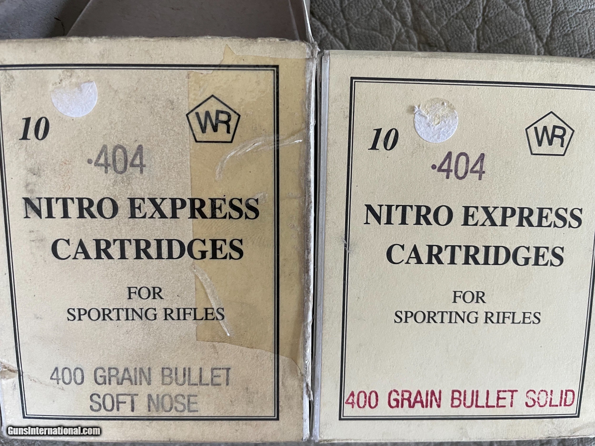 Description: .404 WR AMMO (2) BOXES 400 GRAIN SOFT POINT AND (1) BOX OF 400 GRAIN SOLIDS 10 ROUND BOXES $75 PER BOX OR ALL THREE BOXES $200 SOLD Rifle Caliber: .404 Jeffery |