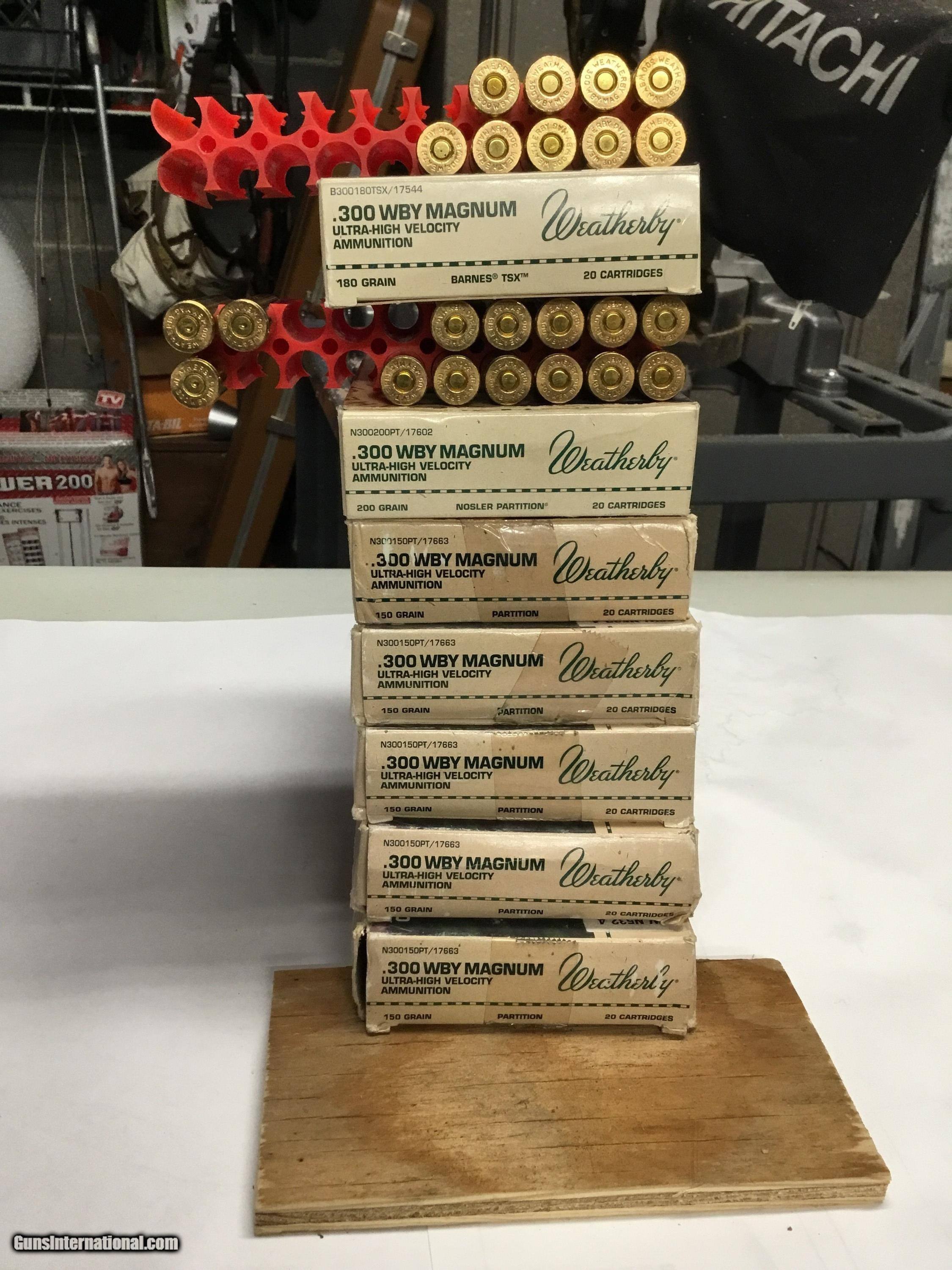 Description: Five boxes of 300 weatherby magnum, 150 grain Nosler Partition. Also 11 rounds of 300 weatherby magnum with 200 grain Nosler Partition, AND 9 rounds of 300 weatherby magnum with Barnes 180 grain TSX bullet. See photo. All are factory ammo. Excellent condition. Combined total rounds = 120. SOLD Rifle Caliber: .300 Weatherby Magnum |