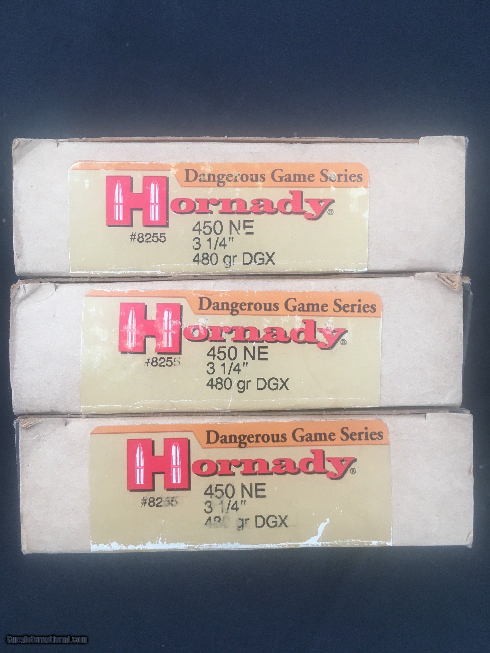 Description: Hornady Dangerous Game Series 450 NE 3 1/4" 480 grain DGX 3 boxes - 60 rounds FREE SHIPPING EXCELLENT CONDITION PAYMENT BY CHECK OR MONEY ORDER ONLY ON NON GUN ITEMS PLEASE EMAIL INQUIRY ONLY ON NON GUN ITEMS SOLD |