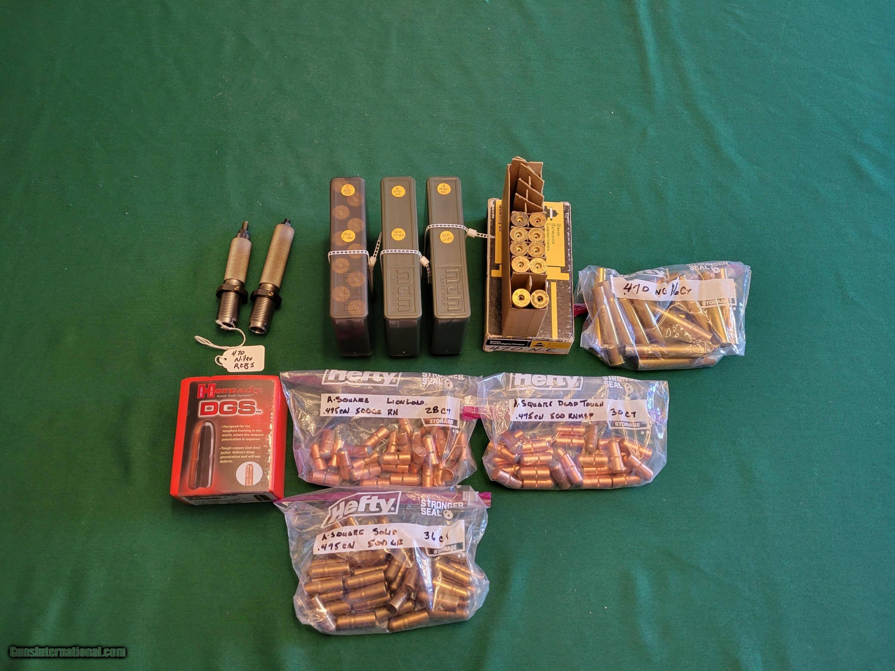 470 Nitro Express dies, Bell brass, A-Square bullets, reloads, etc.