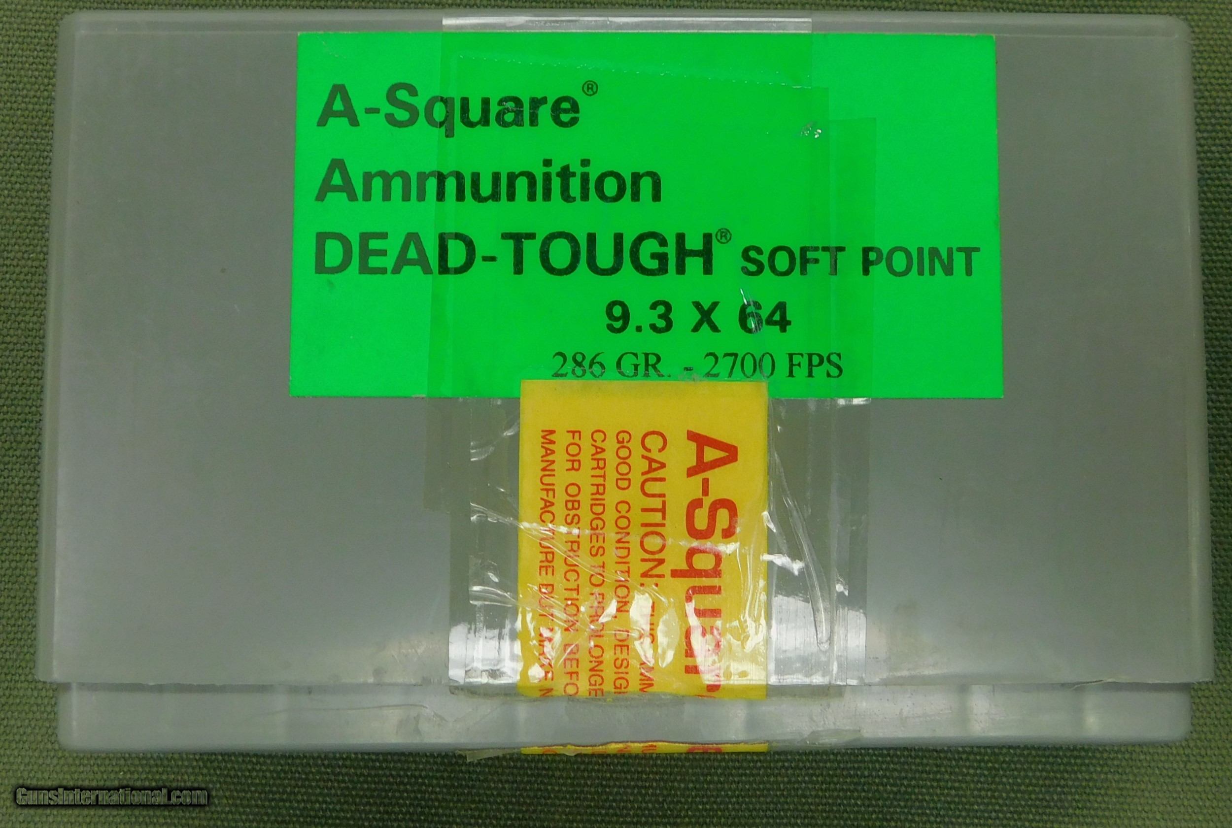 Description: one box of each A-square 9.3 x 64 286 gr dead tough, monoithic solid,lion load. 60 rds total. $200.00 for all. shipping included SOLD |