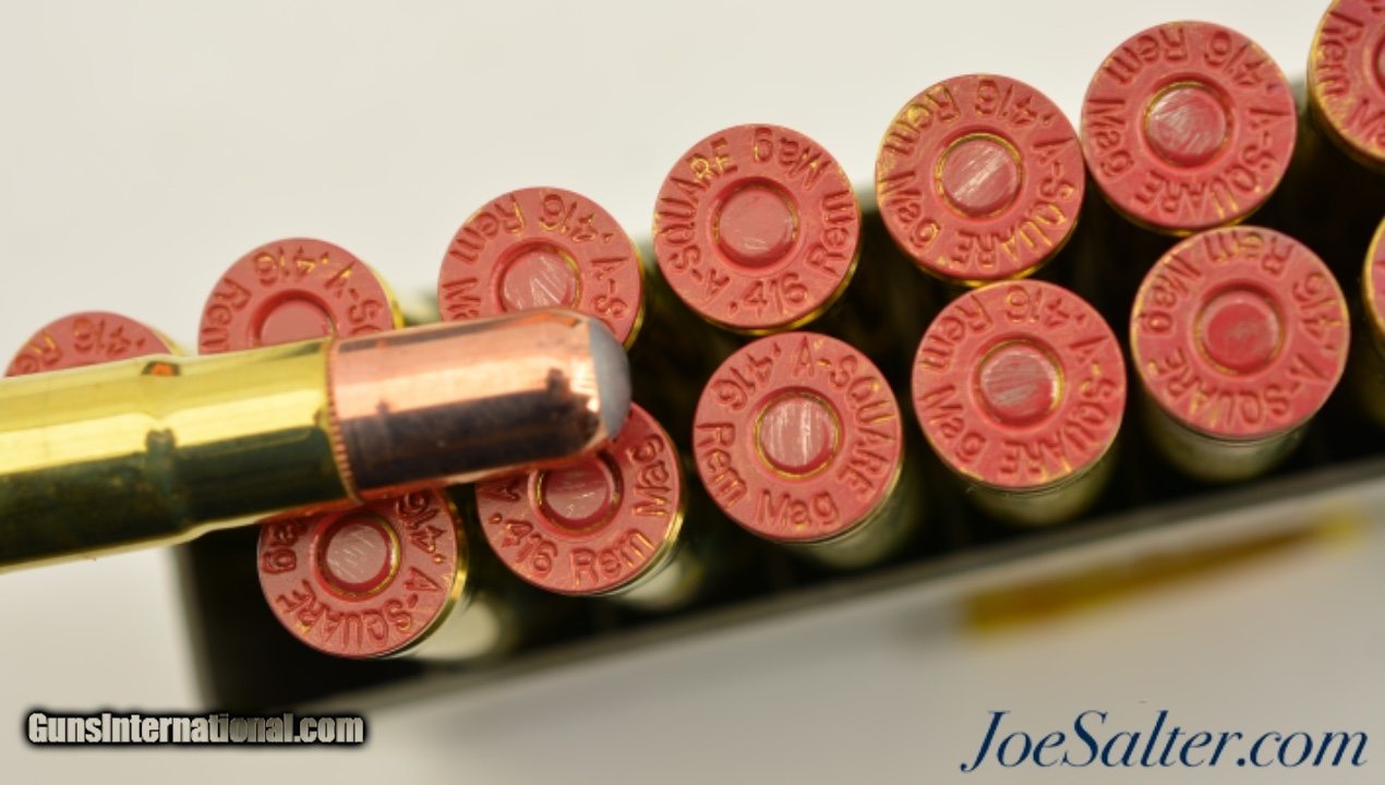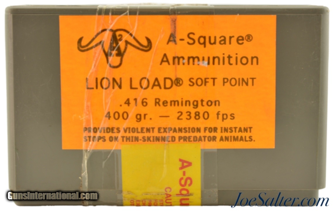 Description: This is a NOS box of A-Square Ammunition Lion Loads SP .416 Rem. 400gr. Traveling at 2380fps. Some of the finest ammunition made. SOLD |