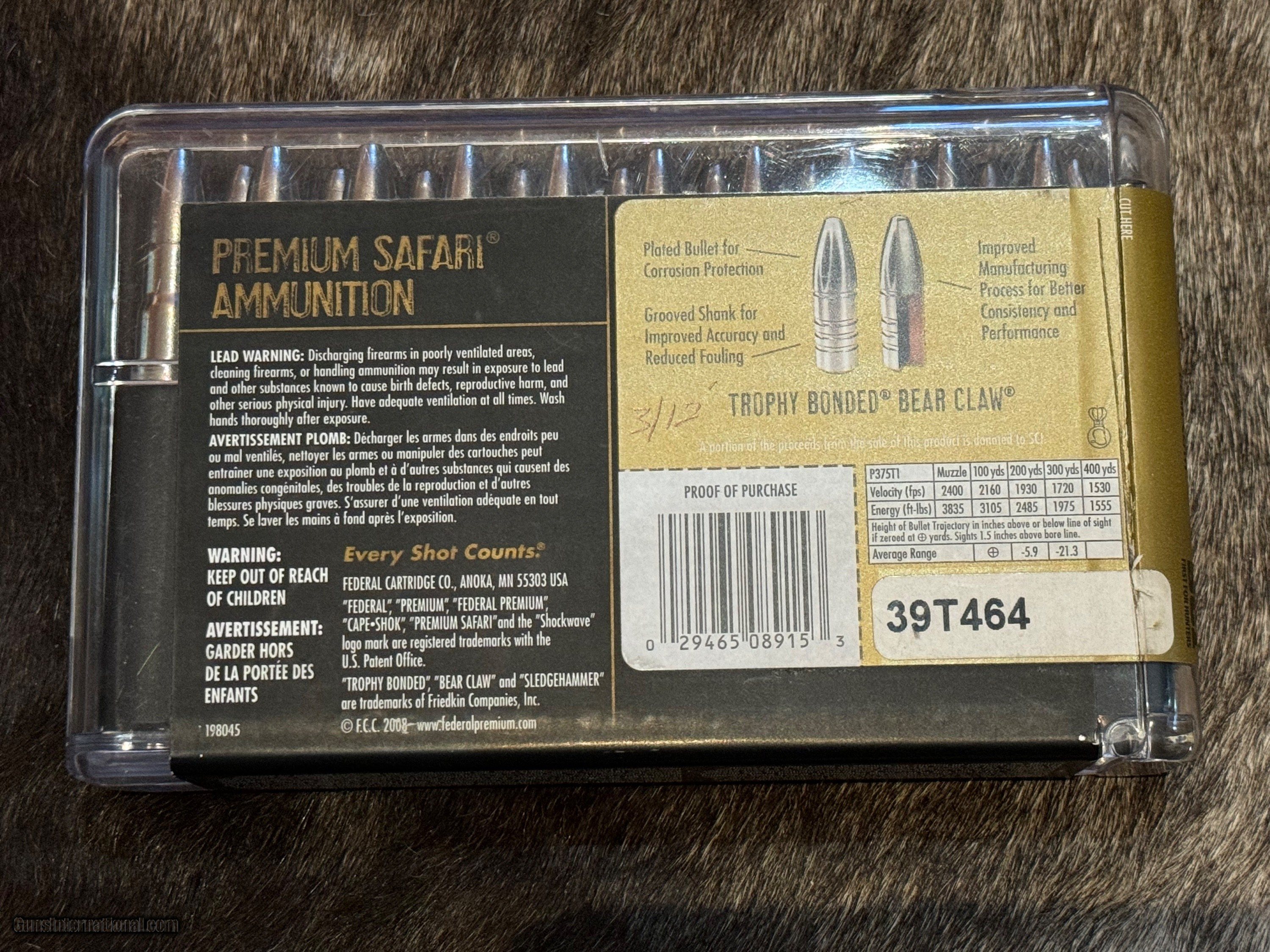 Description: Hello, I bought these for a Safari that never happened. I am selling these and some other Federal Premium in 375 H&H in a separate ad. You are buying one box of 20 rounds Federal Premium Safari 375 H&H 300 Grain Trophy Bonded Bear Claw Tbe seal has been broken by me to look at the mmo. I never cycled any rounds through a rifle. This is factory ammo with Federal factory applied blue sealant paint on the primer. shipping is $20 I will combine shipping and charge actual cost of shipping if you buy multiple other boxes of ammo I have listed for sale. SOLD Rifle Caliber: .375 H&H Magnum |