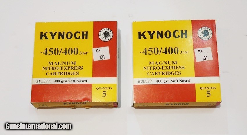 Description: KYNOCH .450/400 3 1/4" MAGNUM NITRO EXPRESS AMMO, 400 GR SOFT NOSE, 2 BOXES, 5 ROUNDS EACH, Price: $160.00 Contact Seller |