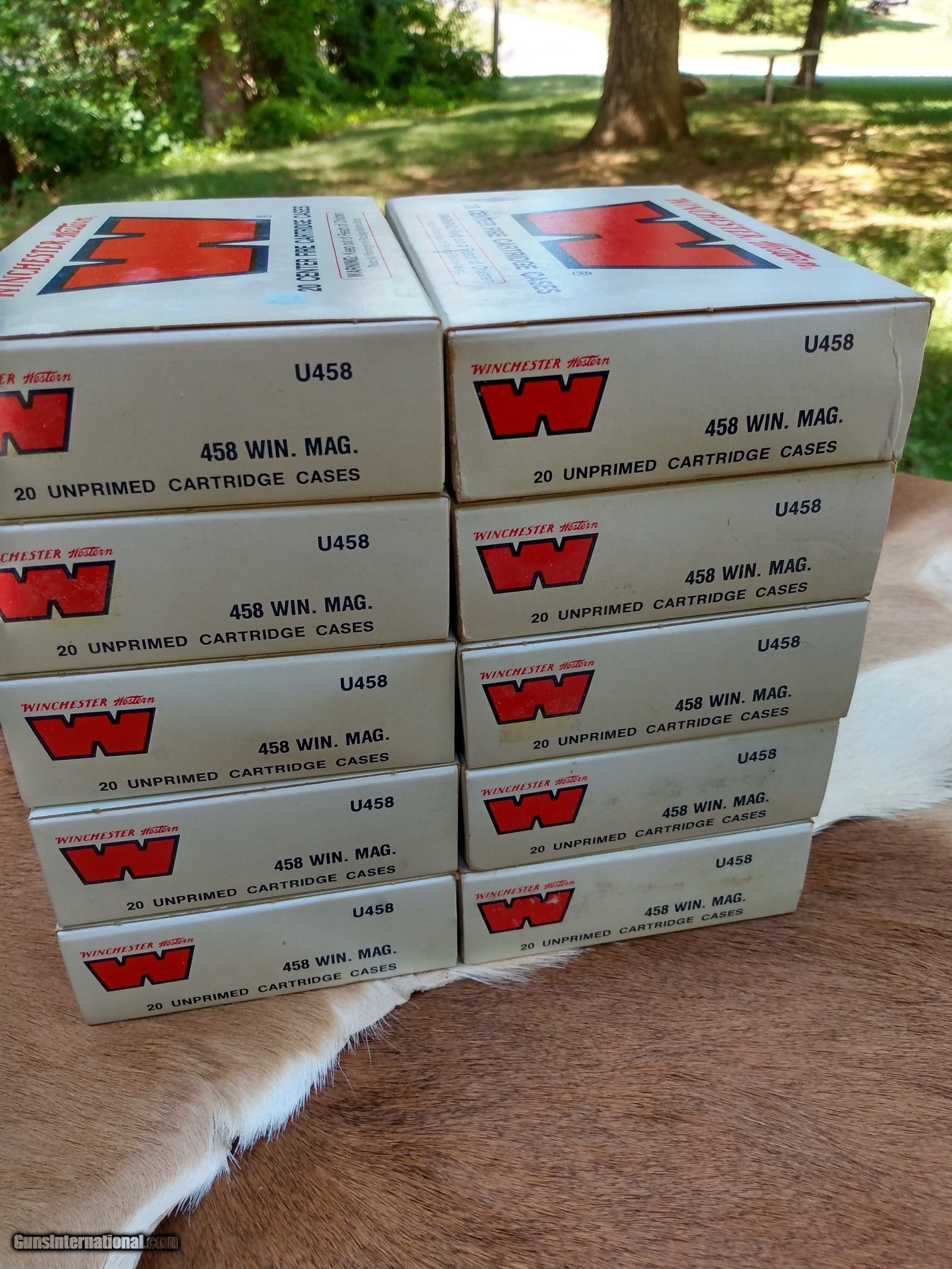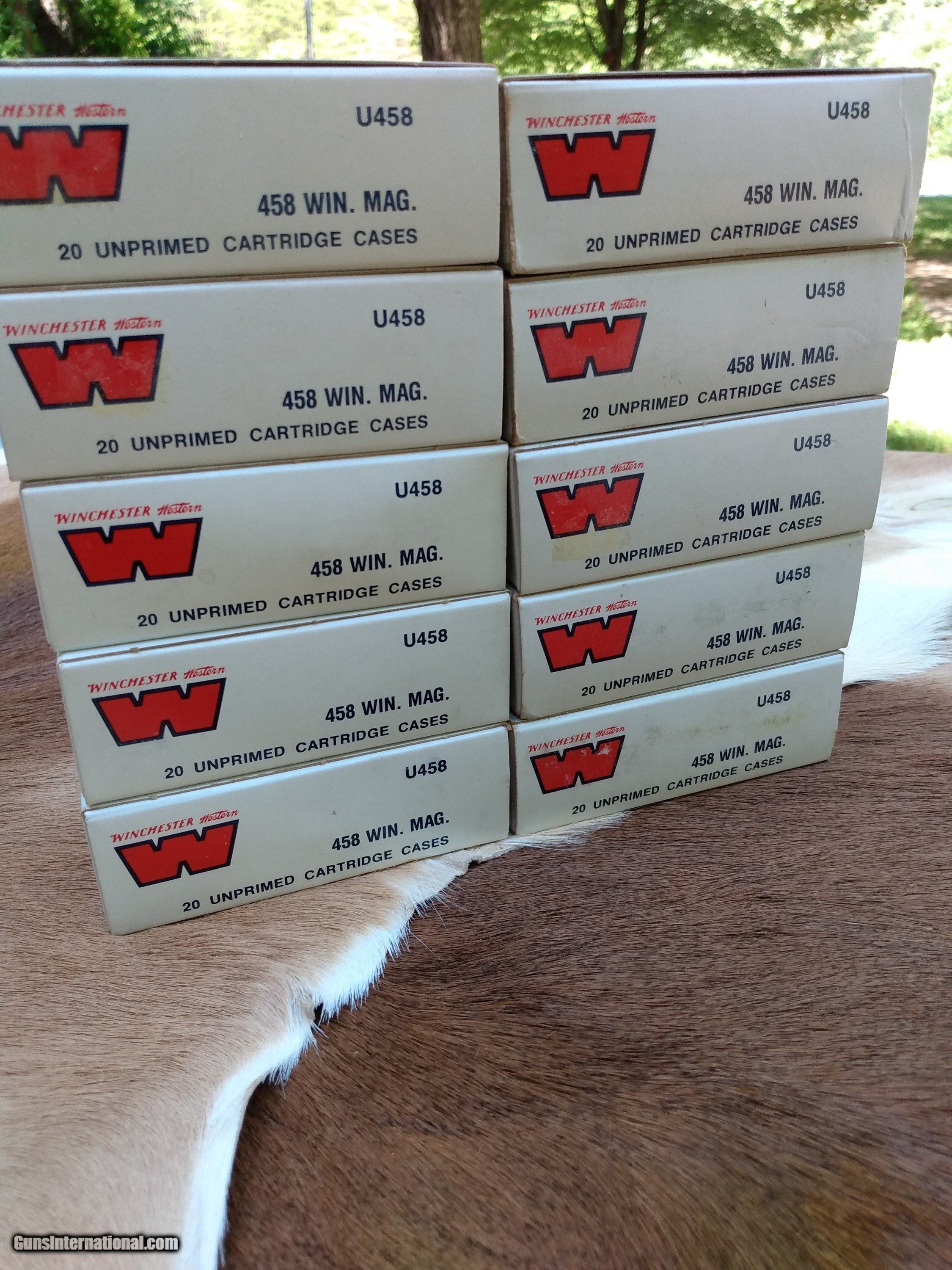 Description: (SOLD ) NEW .458 WIN. MAG. ..WINCHESTER Brass. 10 boxes of 20 rds. ea. (200 Total rounds) Unprimed. FREE SHIPPING TO LOWER 48 ON THIS ORDER. SOLD |