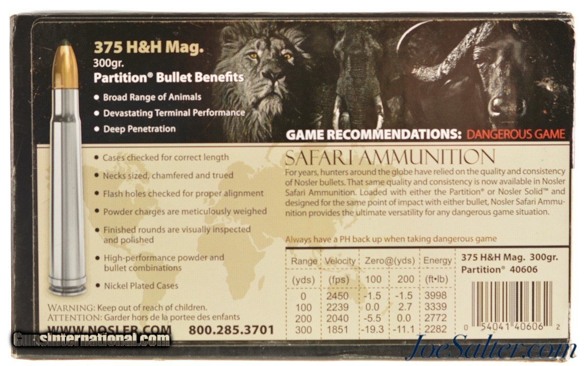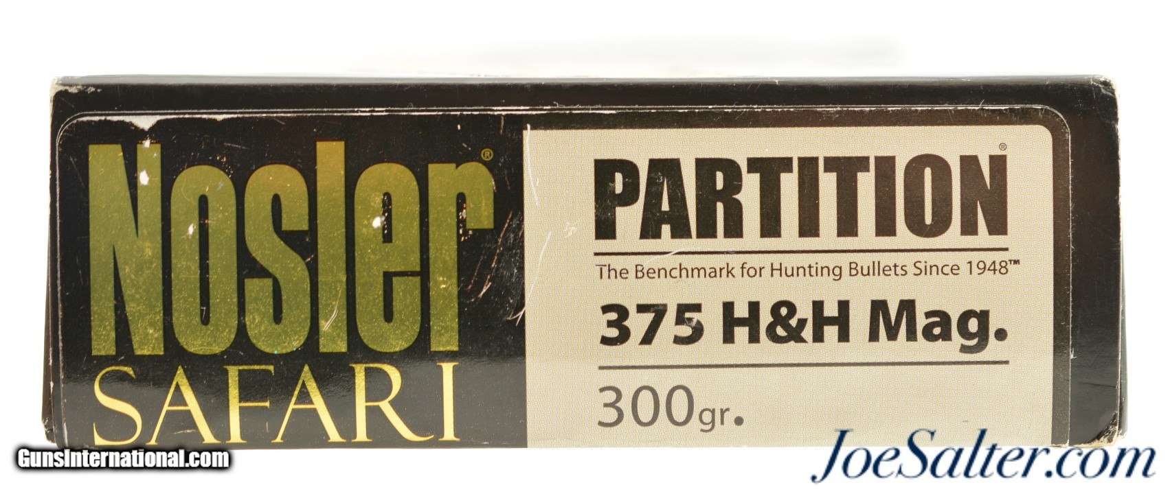 Description: This is a NOS box of 20, Nosler Safari 375 H&H 300gr. Partition ammunition.; Price: $110.00 Contact Seller |