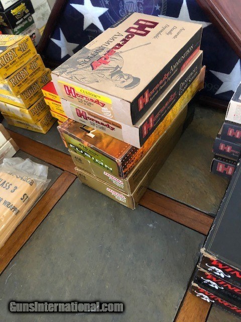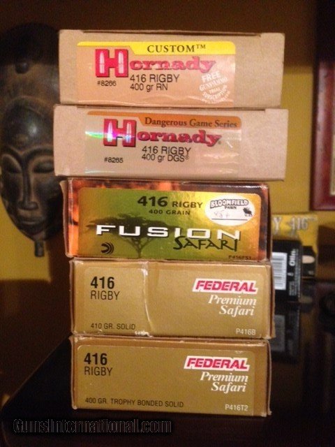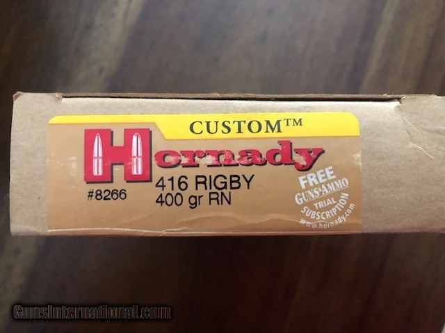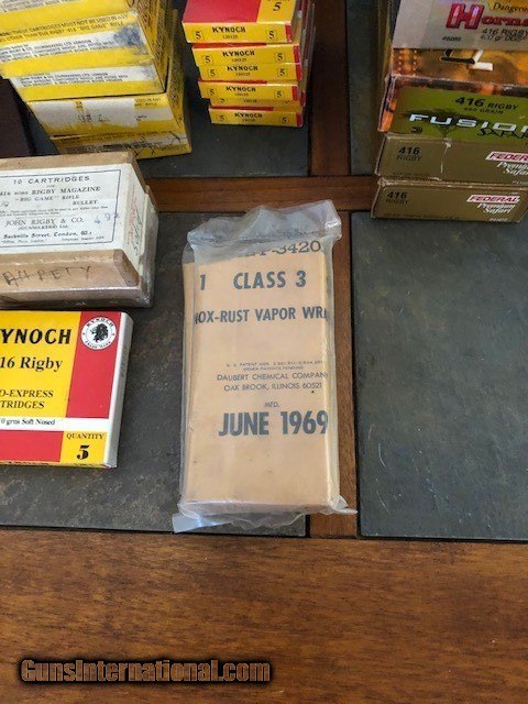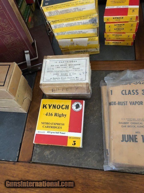 Description: I have 7 BOXES of VINTAGE ORIGINAL RIGBY ammo in .416 Rigby, a surplus of various boxes new various makers/loads of .416 Rigby. 1 box 20 rnds Hornady Custom .416 Rigby 400gr. RN $100.00 1 box 20 rnds Hornady Dangerous Game .416 Rigby 400gr. DGS $125.00 1 box 20 rnds Fusion Safari .416 Rigby 400gr. Fusion Bullet $100.00 1 box 20 rnds Federal Premium Safari .416 Rigby 410gr. Solid $100.00 1 box 20 rnds Federal Premium Safari .416 Rigby 400gr. Trophy Bonded Solid $100.00 1 box 5 rnds Kynoch .416 Rigby 410gr. Soft Nose $50.00 I also have .375H&H, .45acp & .44Rem.Mag. (see my other listings posted on 3/3/21). Pricing adjusted to quantities purchased...you pay shipping. SOLD Rifle Caliber: .416 Rigby |