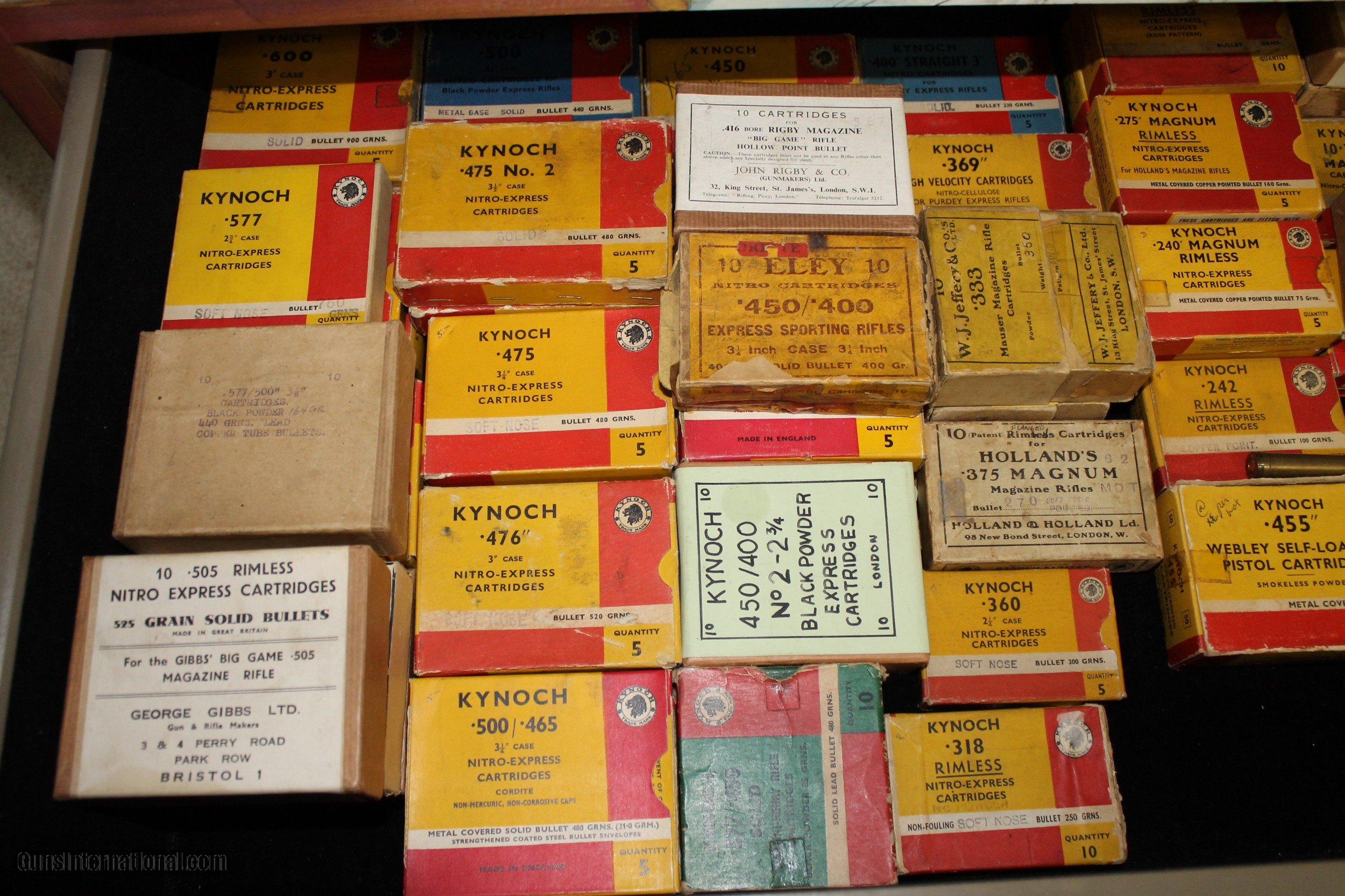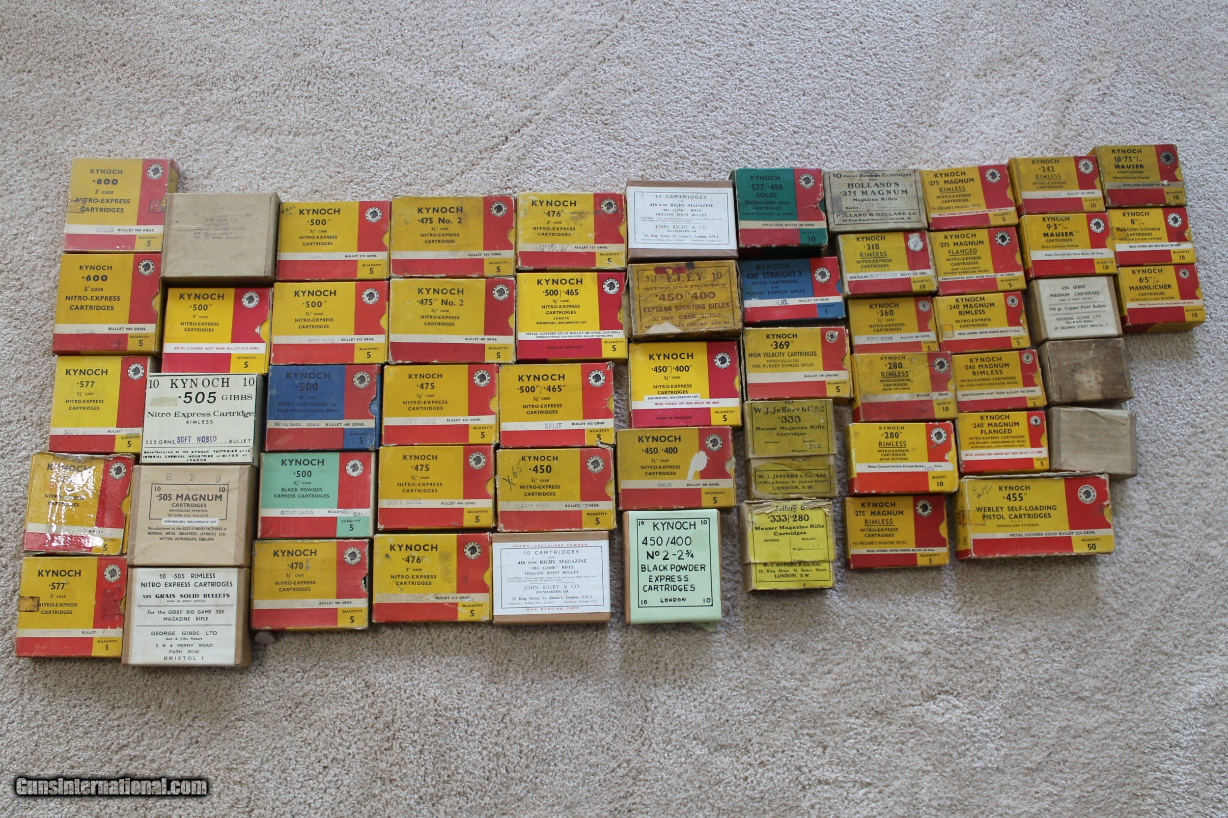 Description: I have been collecting British double rifles since 1971 and am now starting to move some stuff I acquired over the years. This lot includes eight loaded boxes: .450 Kynoch 3 1/4 BPE, .450 Kynoch 3 1/4" BPE, both include 5 loaded cartridges, one box of 5 Kynoch .475 3 1/2 No.2 nitro, one box of 5 Kynoch .450 3 1/4" nitro, one box of 10 Eley-Boxer .500 3" BPE in original paper with string wrapping (NOTE:THIS BOX OF 10 ELEY-KYNOCK .500 3" HAS BEEN SOLD), one box of 10 Eley .360 Express 2 1/4" in original wrapping. One box of 10 Kynoch 9MM Mauser, one box of 50 Kynoch 570 grain soft nose bullets. 55 empty boxes from .600 NITRO to Kynoch 6.5 Mannlicher. SOLD |