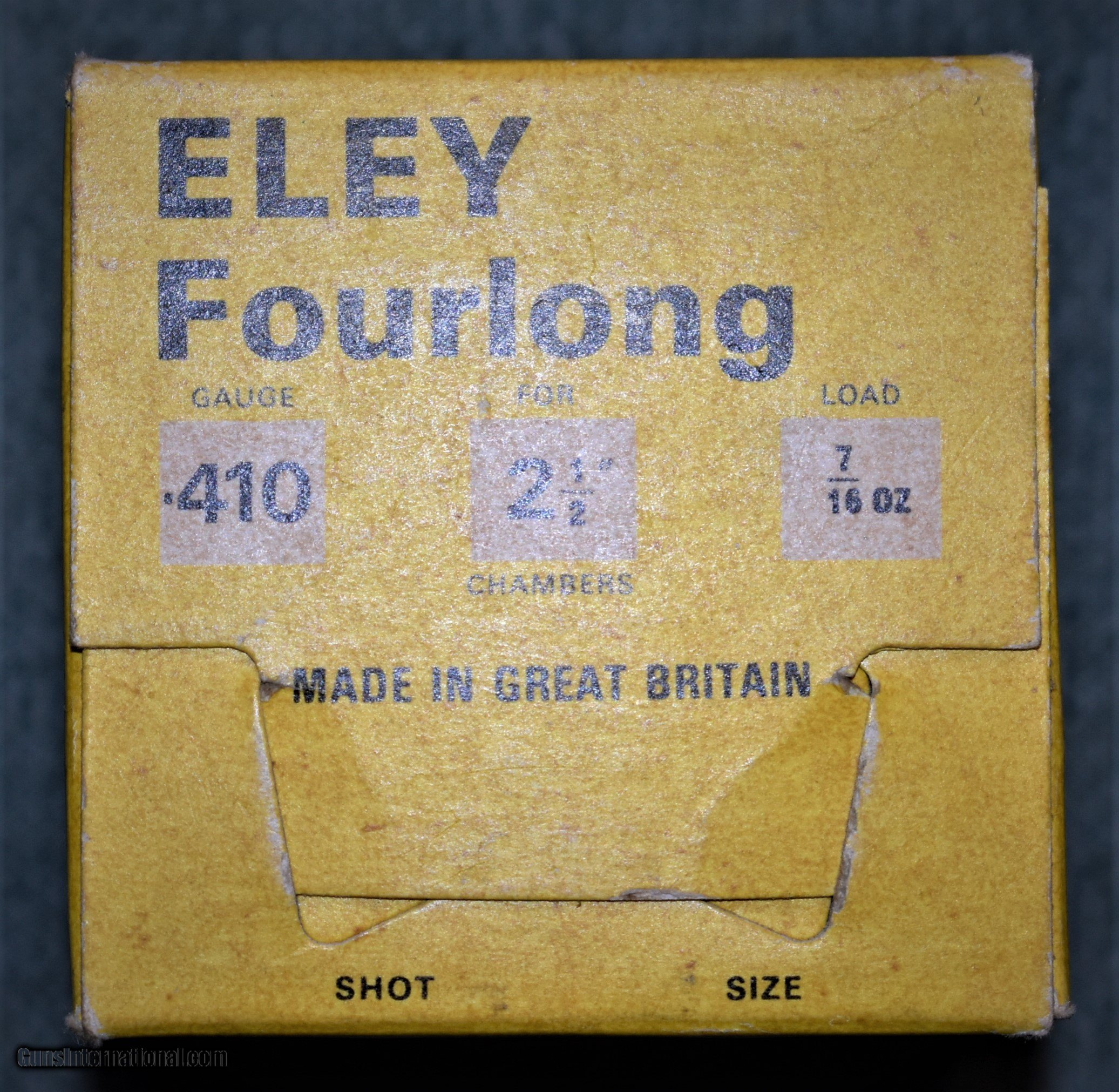 Description: Box of Eley Fourlong 410 shotshells.21/2" and 7/16 oz of #7 shot. Excellent condition. SOLD Shotgun Gauge: .410 Gauge |