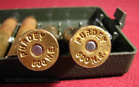 Description: 10 round box of .600 Nitro Express ammunition by James Purdey & Sons Ltd. and so headstamped. 900 gr Woodleigh soft point bullets. Cased in a plastic snap case. Ready to use or a great gunroom conversation piece. SOLD |