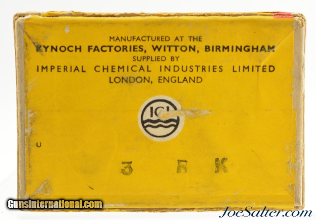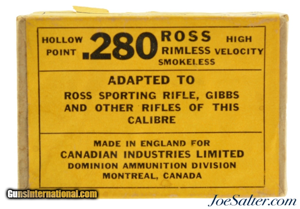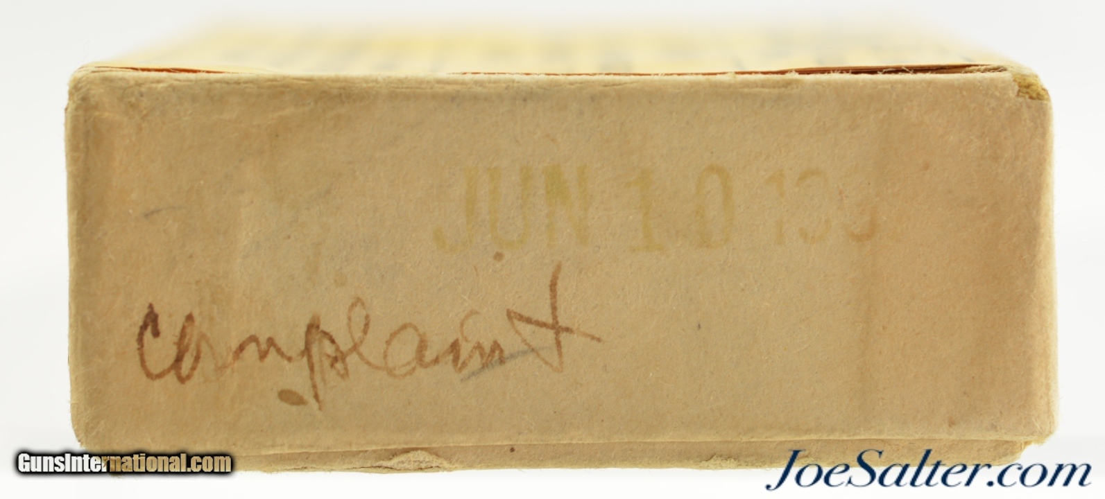 Description: This is a full box, 10 original rounds, of .280 Ross Rimless ammunition manufactured by Kynoch in England for C-I-L Dominion in Canada with 160 grain hollow point bullets. The two piece yellow and black box is dated June 10, 1967 on the side with an interesting hand written word "complaint" in faded ink. The box remains solid with an excellent bright label. The cartridges are in excellent condition still in the original paper. A great box to pair with your Ross or Gibbs rifle. SOLD |