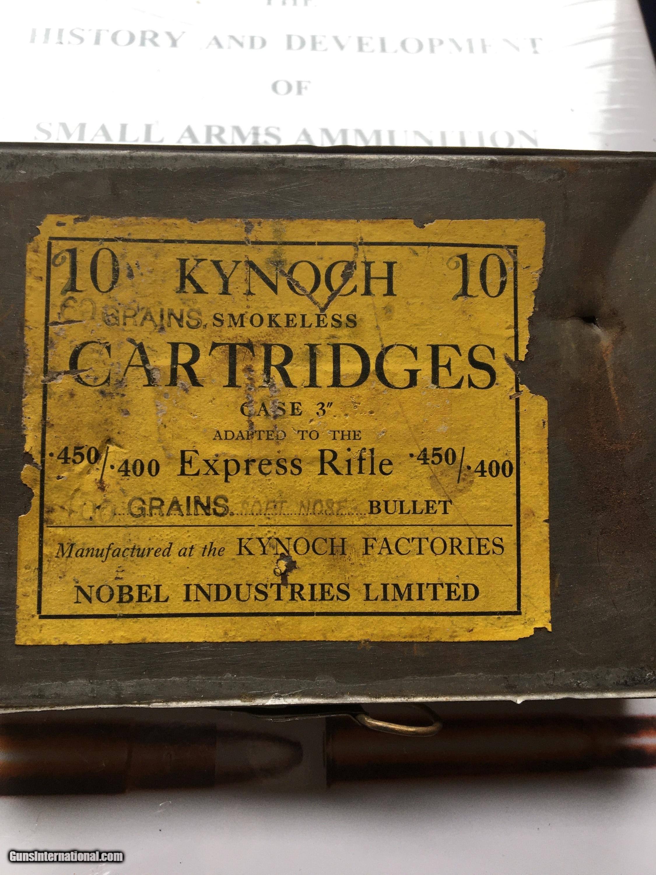 Description: Early Tropical Tin of Kynoch 450-400 3" Nitro cartridges, in a nicely sealed Tin. 10 rds of Ammo with a pretty decent condition label. $175 plus shipping SOLD Rifle Caliber: .450/400 Nitro Express |