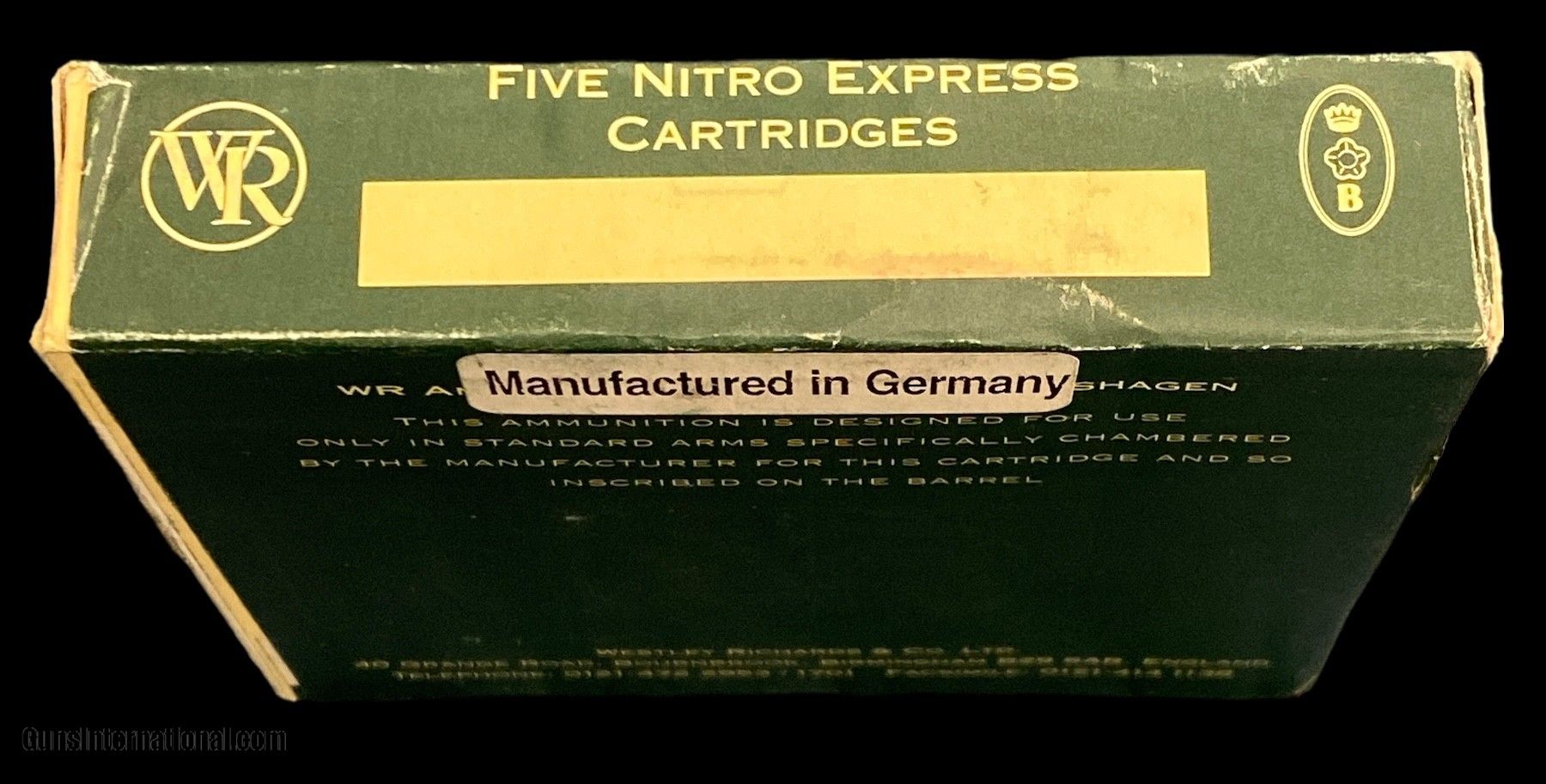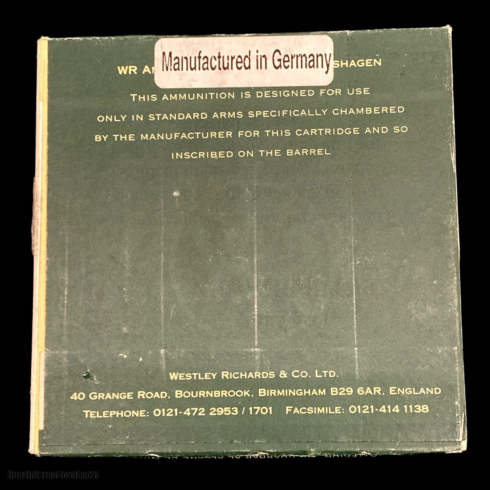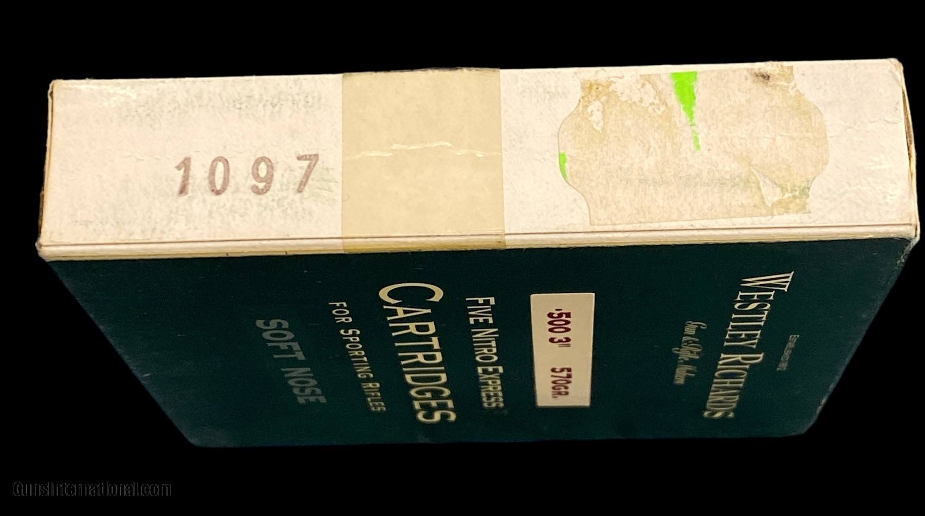 Description: WESTLEY RICHARDS AS NEW OLD-STOCK 500 - 3" NITRO 570 GR SOFT POINT UNOPENED IN ORIGINAL BOX APPEARS TO BE MADE "10-97" A NICE COLLECTIBLE FOR YOUR GUN ROOM OR FOR USE ON YOUR NEXT SAFARI! FLAT $19 S/H/I FOXTROT IS A PURVEYOR OF FINE FIREARMS - WE PURCHASE, SELL, CONSIGN, TRADE, AND IMPORT FROM AROUND THE WORLD. OUR OWNER, FRANCIS LOMBARDI, HAS BEEN IN THE FINE FIREARMS BUSINESS SINCE 1987 AND WAS THE FORMER DEPARTMENT HEAD OF THE ESTEEMED JAMES JULIA COMPANY (THEN THE WORLD'S FOREMOST EER OF HISTORIC, ICONIC, AND RARE FIREARMS ACROSS ALL CATAGORIES). WE ARE ALSO THE US AGENT FOR KARL HAUPTMAN OF FERLACH, AUSTRIA - MAKER OF THE UNIQUE TRIPLE BARREL SxSxS AND ALSO KYNOCH AMMUNITION. FINDER FEES PAID FOR REFERRALS. PLEASE CALL NOW! SOLD Rifle Caliber: .500 Nitro Express |