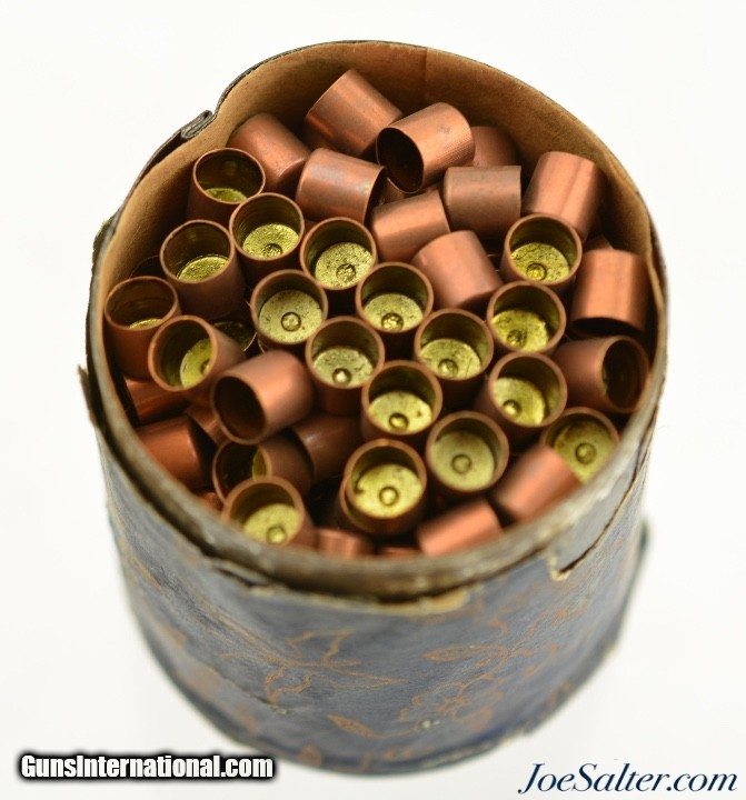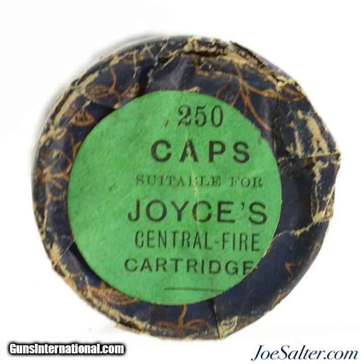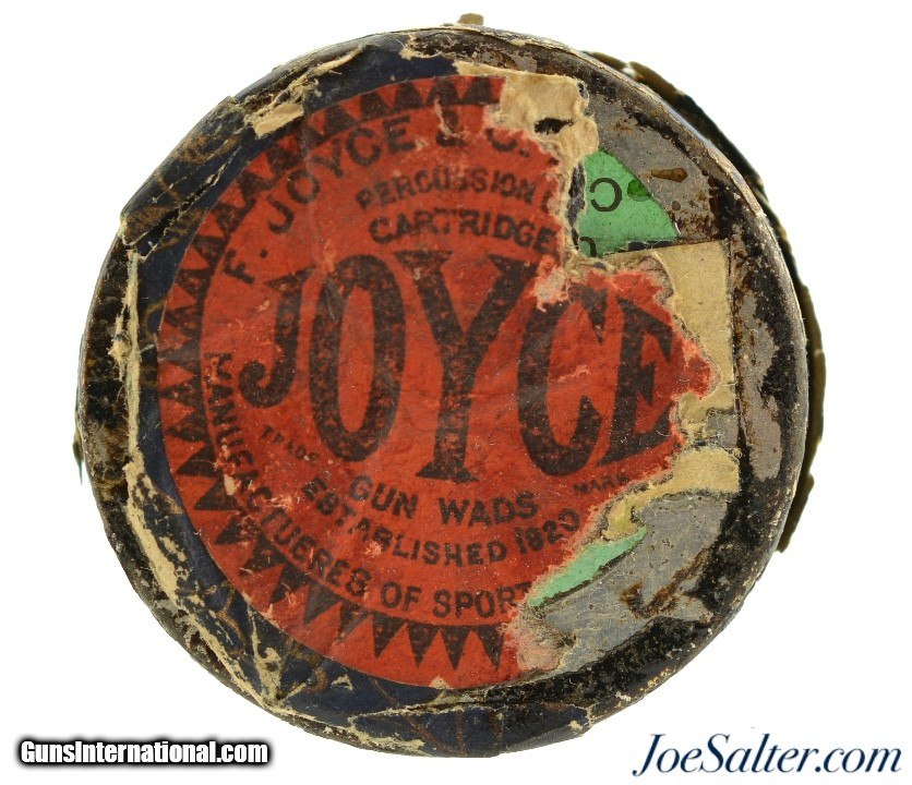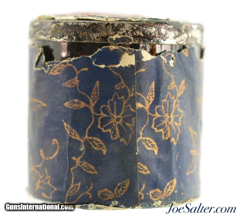 Description: This is a full, 250 count, percussion cap tin manufactured by F. Joyce & Co. in England. The pre-1900 tin retains the original paper outer wrapping with only small pieces missing at the top revealing the lacquered outer sides of the tin. A great looking piece. Price: $125.00 Contact Seller |