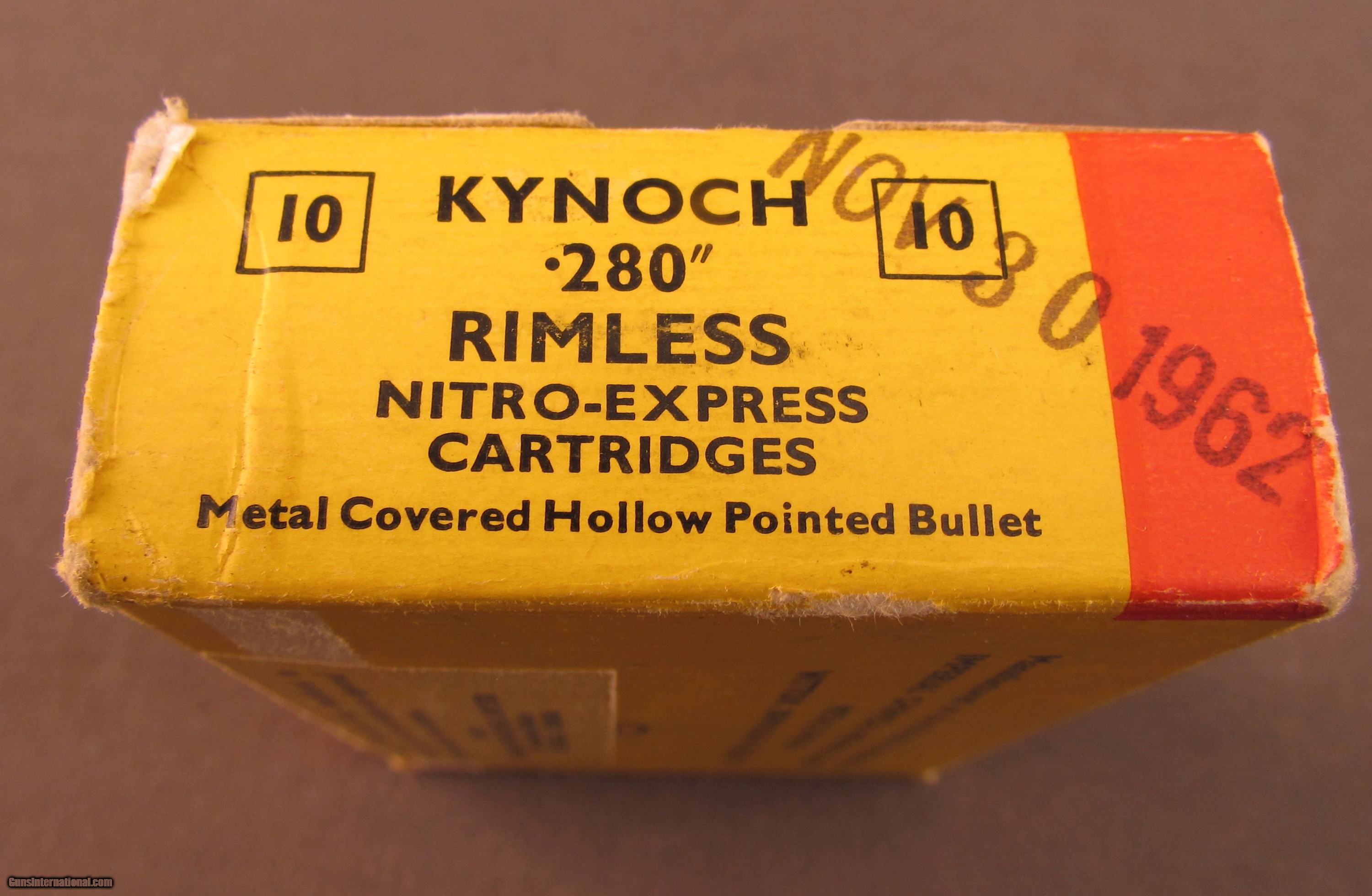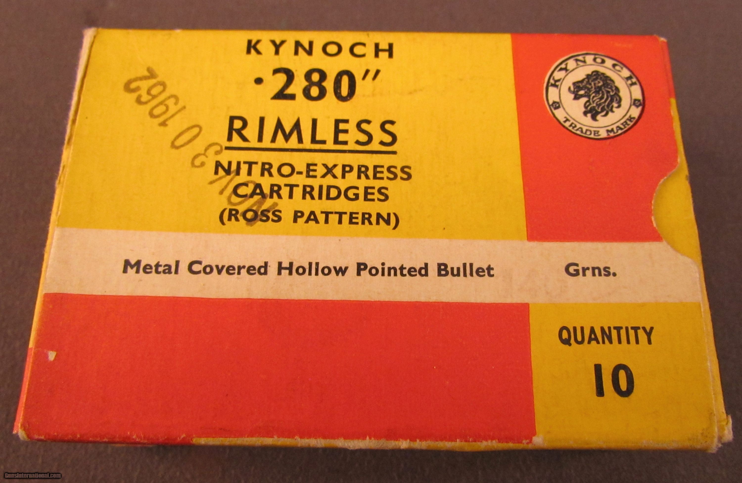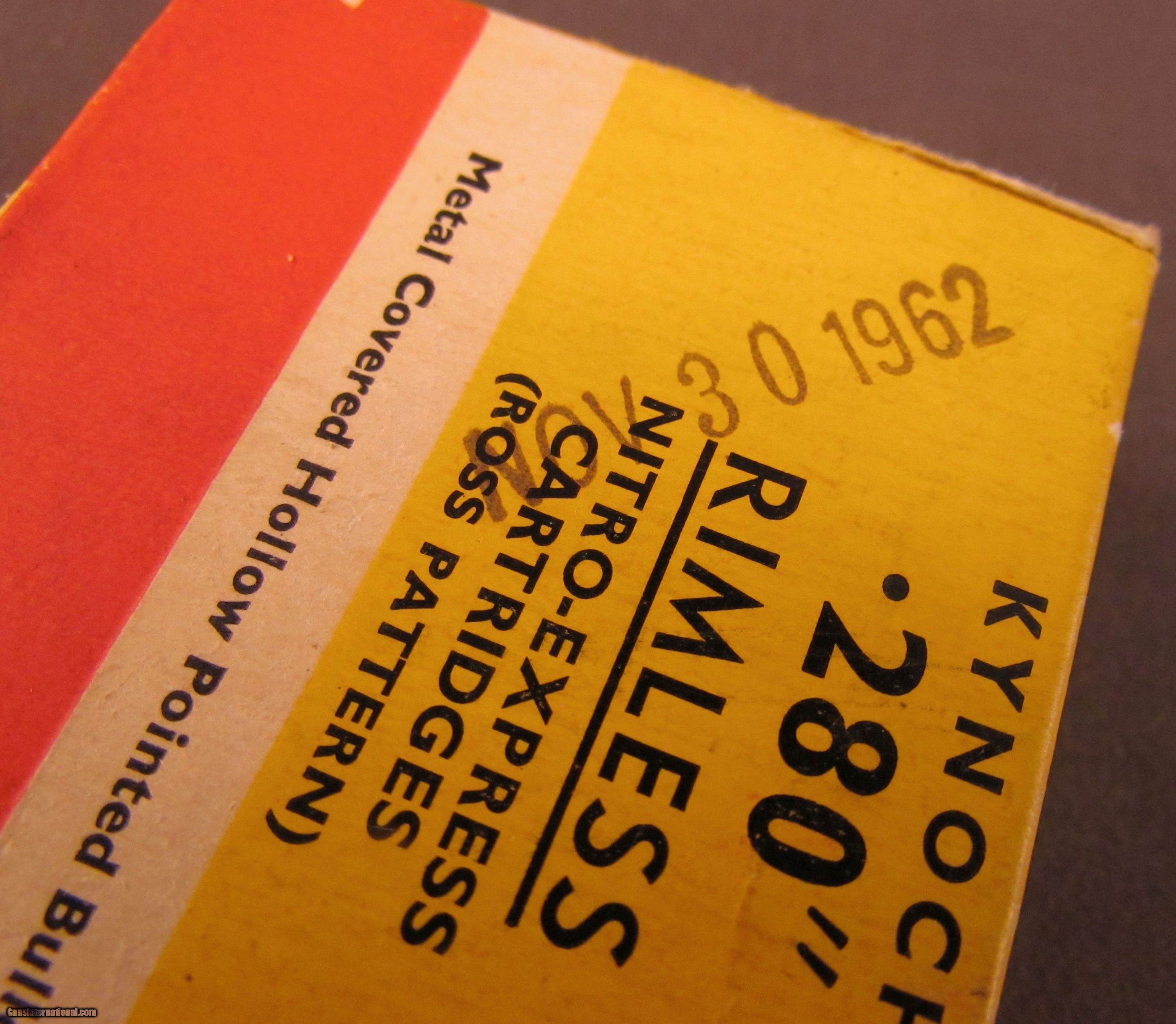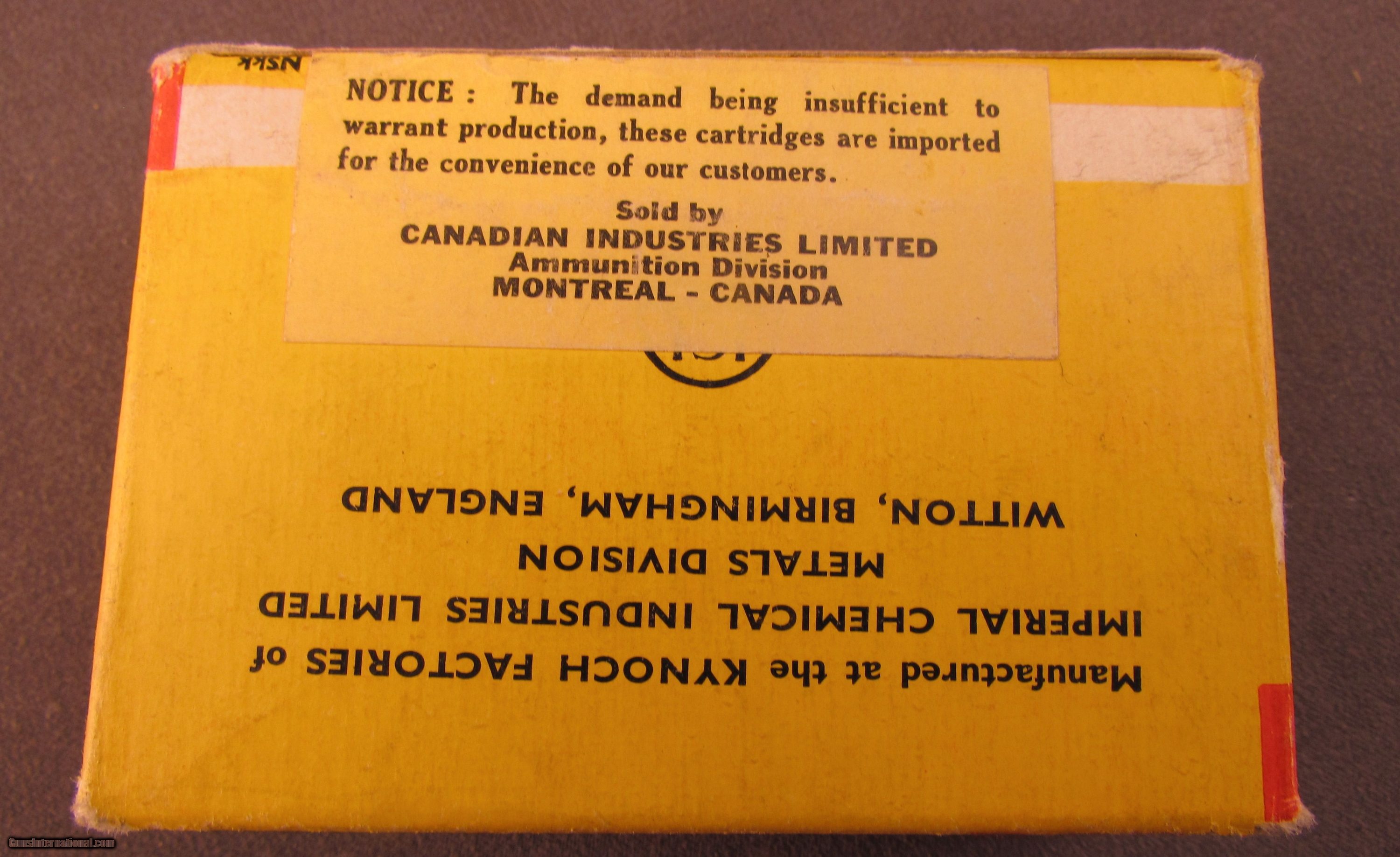 Description: Original box of 10 cartridges built by Kynoch, 280 rimless (Ross Pattern) Metal covered hollow pointed bullets 140 gr. These cartridges were imported from Kynoch by CIL in Canada as the demand was insufficient for cil to continue production of the same. The box is dated Nov 30, 1062. The cartridges remain in excellent condition with the original wax wrap. For the cartridge or Ross Rifel Fan. SOLD Manufacturer: Kynoch Model: Ammo Caliber Info: .280 Ross Gauge Info: .280 Ross |