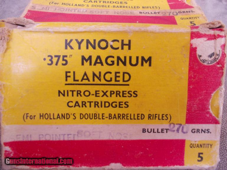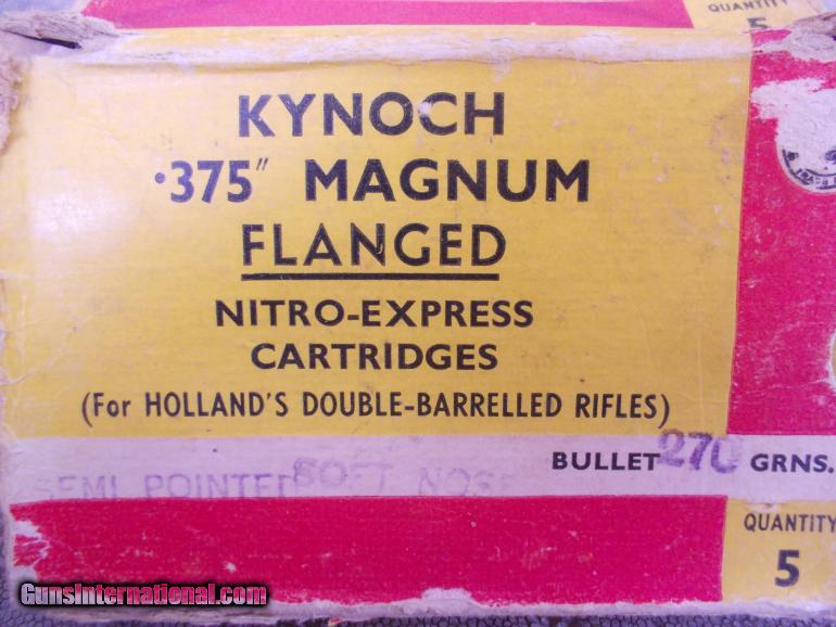 Description: Kynoch 375 flanged magnum 270 grain soft box of 5 , box fair ammo good $35 per box SOLD |