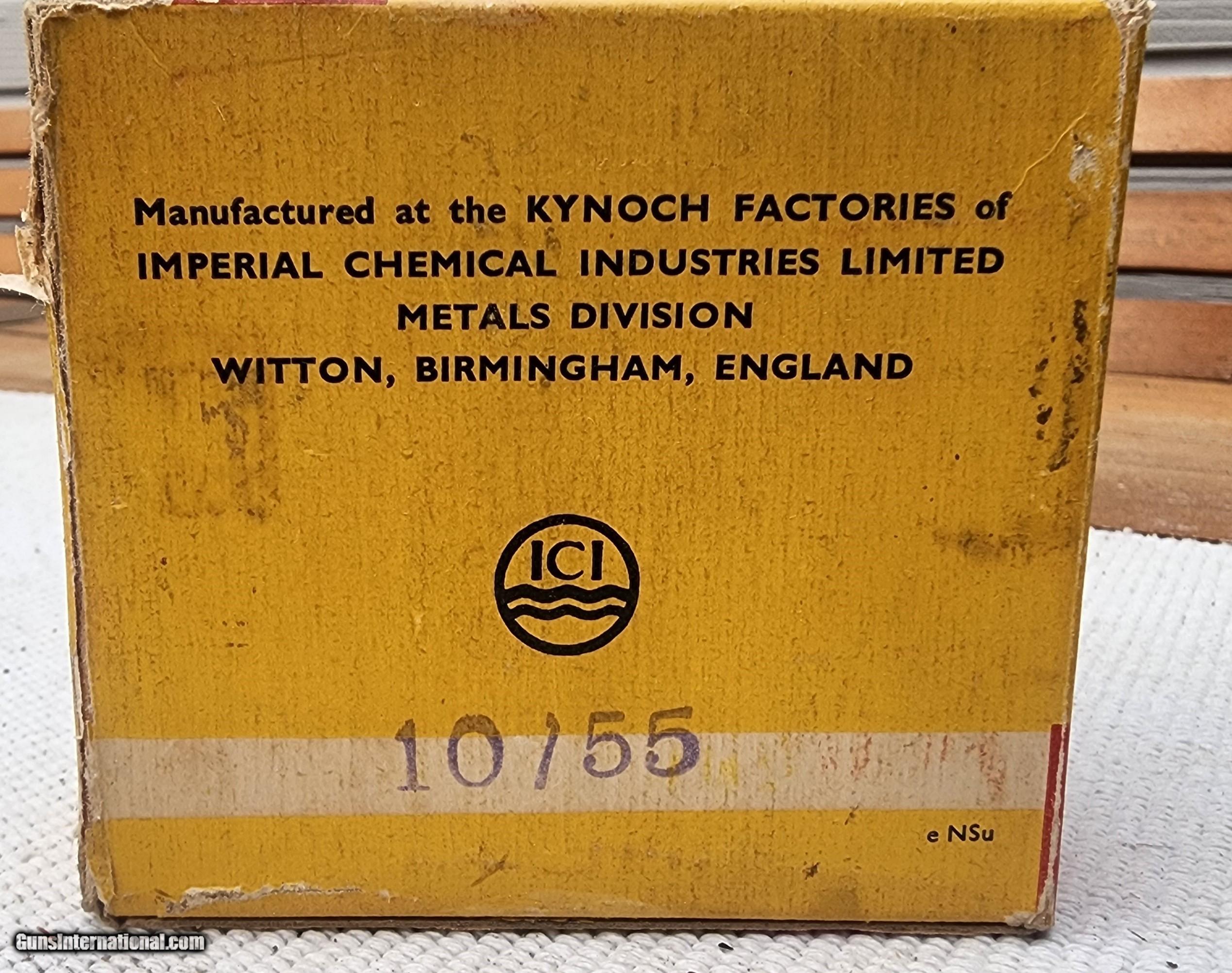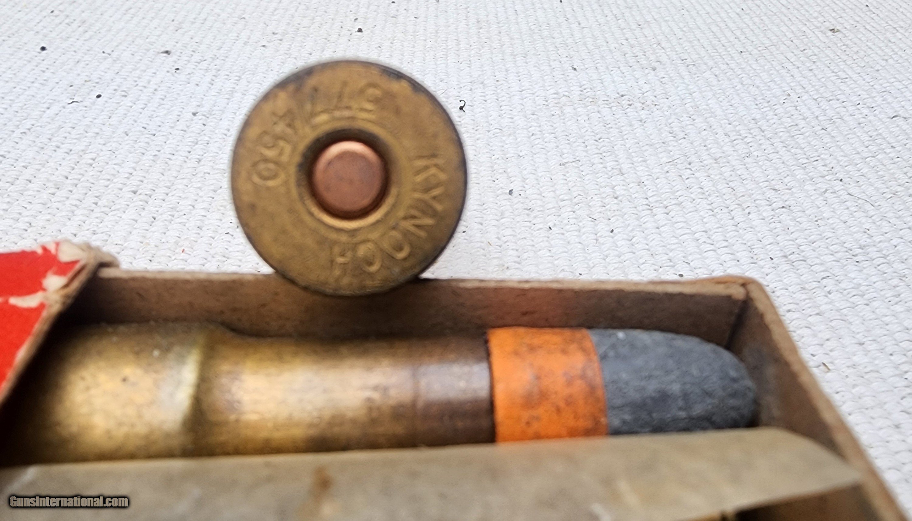 Description: 577/.450 caliber Martini-Henry Rifle smokeless cartridges with 480 grain paper patched solid head bullets. Dated 1955 Box a little tattered Cartriges show age but haven't been messed with. Rifle Caliber: .577/450 Martini-Henry Price: $90.00 Contact Seller |
