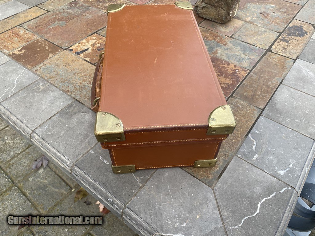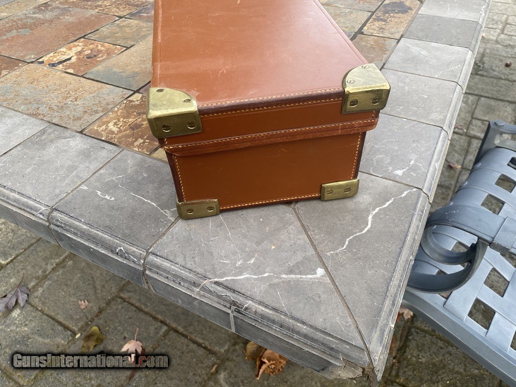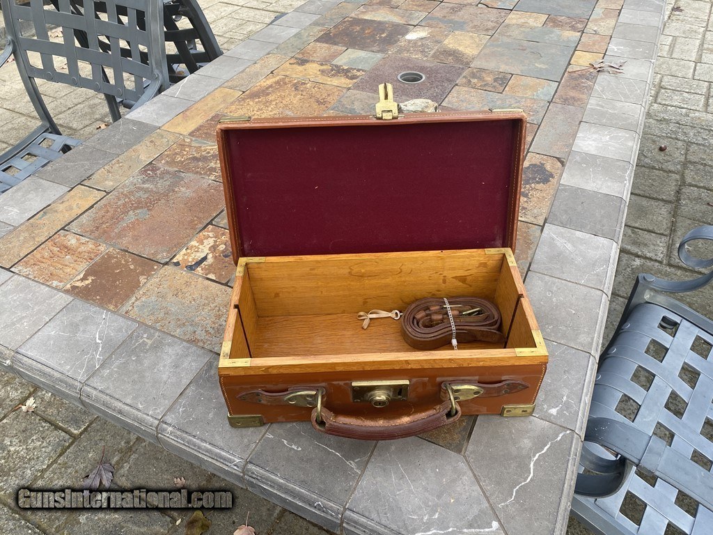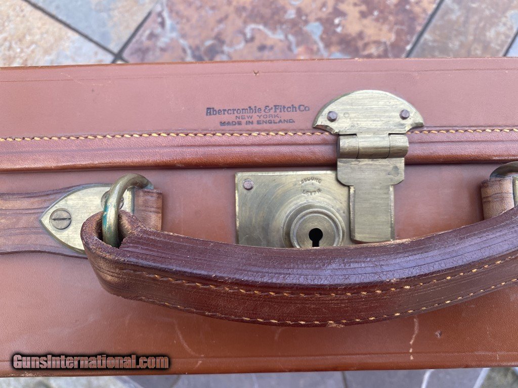 Description: SOLD! Outstanding English made Abercrombie & Fitch Ammo case. Unique size at 7 1/2" x 14 1/2. The case will hold 6 boxes of 12ga shells. Comes with original leather straps and key. SOLD |