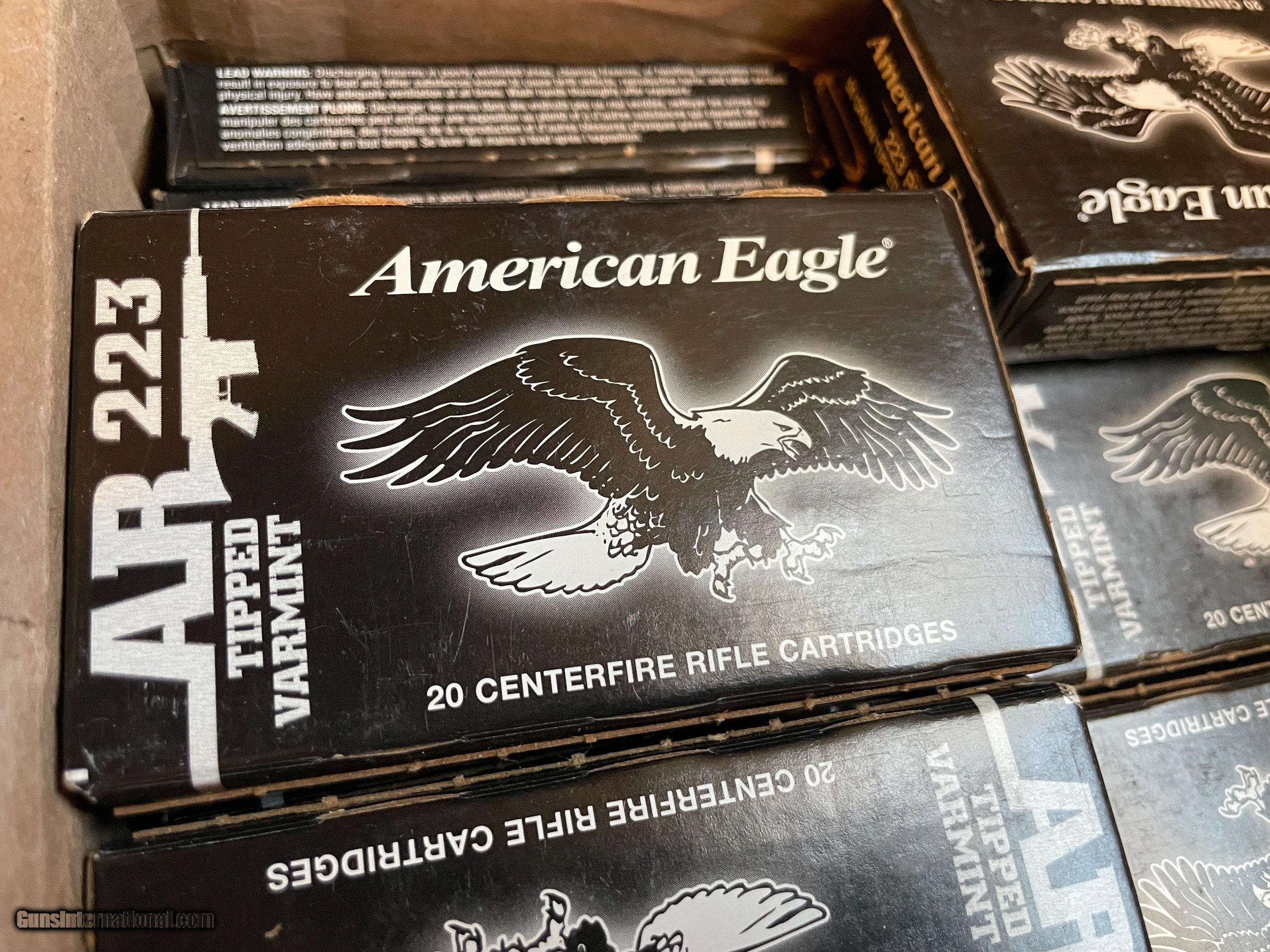Description: I HAVE HERE FOR SALE 59 SEALED BOXES OF FEDERAL EAGLE .223 REMINGTON 50 GRAIN VARMINT TIPPED SOFT POINT ROUNDS. THERE IS A TOTAL OF 1180 ROUNDS. MY PRICE INCLUDES UPS GROUND INSURED SHIPPING. THIS IS NOT FMJ TARGET AMMO, THIS IS VARMINT GRADE AMMO LOADED WITH HORNADY 50 GRAIN V MAX BULLETS. SOLD |