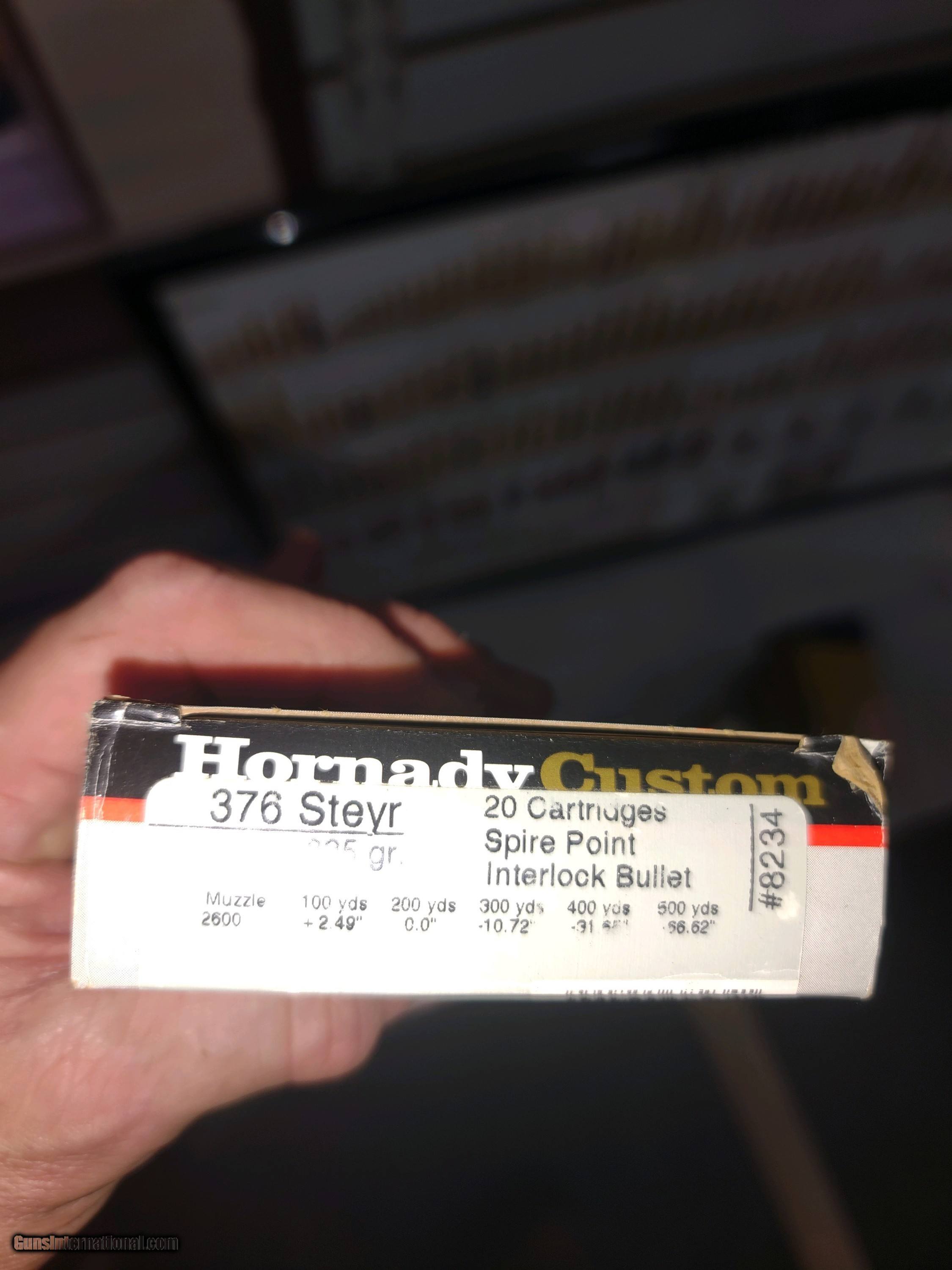 Description: HORNADY .376 STYER 225GR SPIRE POINT INTERLOCK BULLET $69.99 PER BOX. 9 BOXES AVAILABLE SHIPPING IS $20.00 PER BOX. CALL FOR SHIPPING ON MULTIPLES CALL FOR PAYMENT ARRANGEMENTS 606 546-AMM0(2666) SOLD Rifle Caliber: .376 Steyr |
